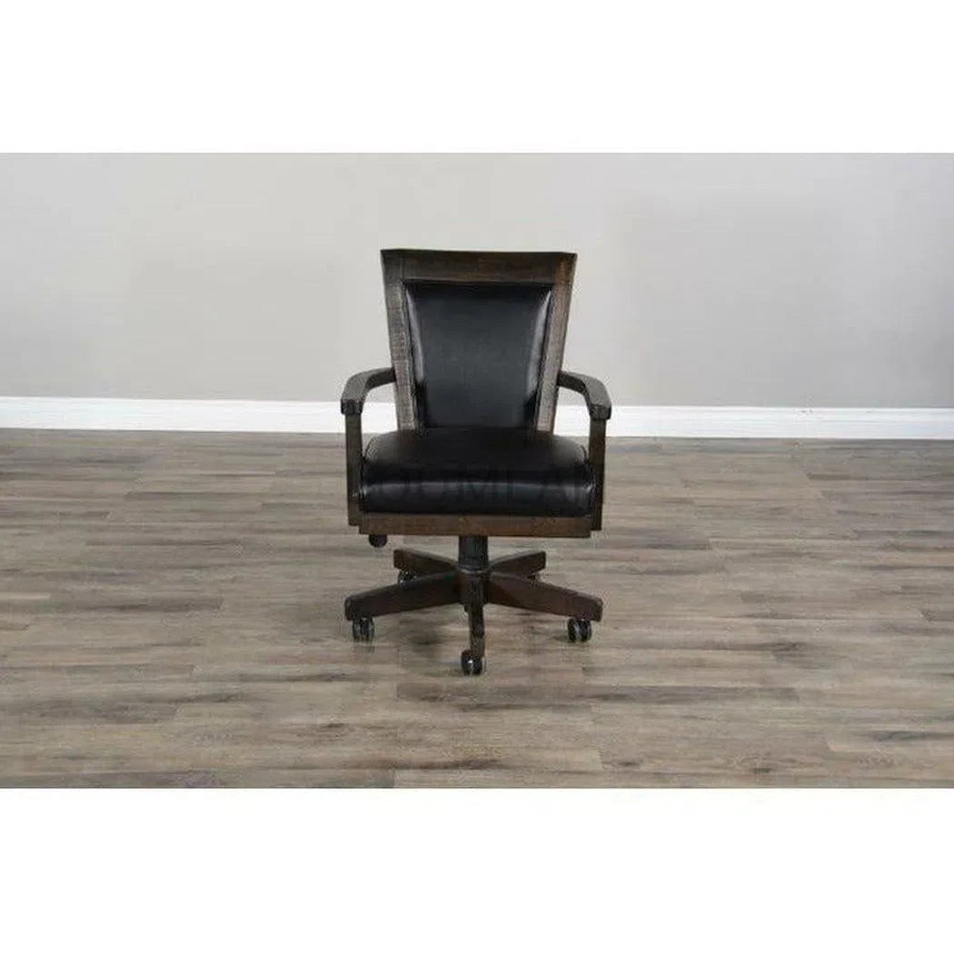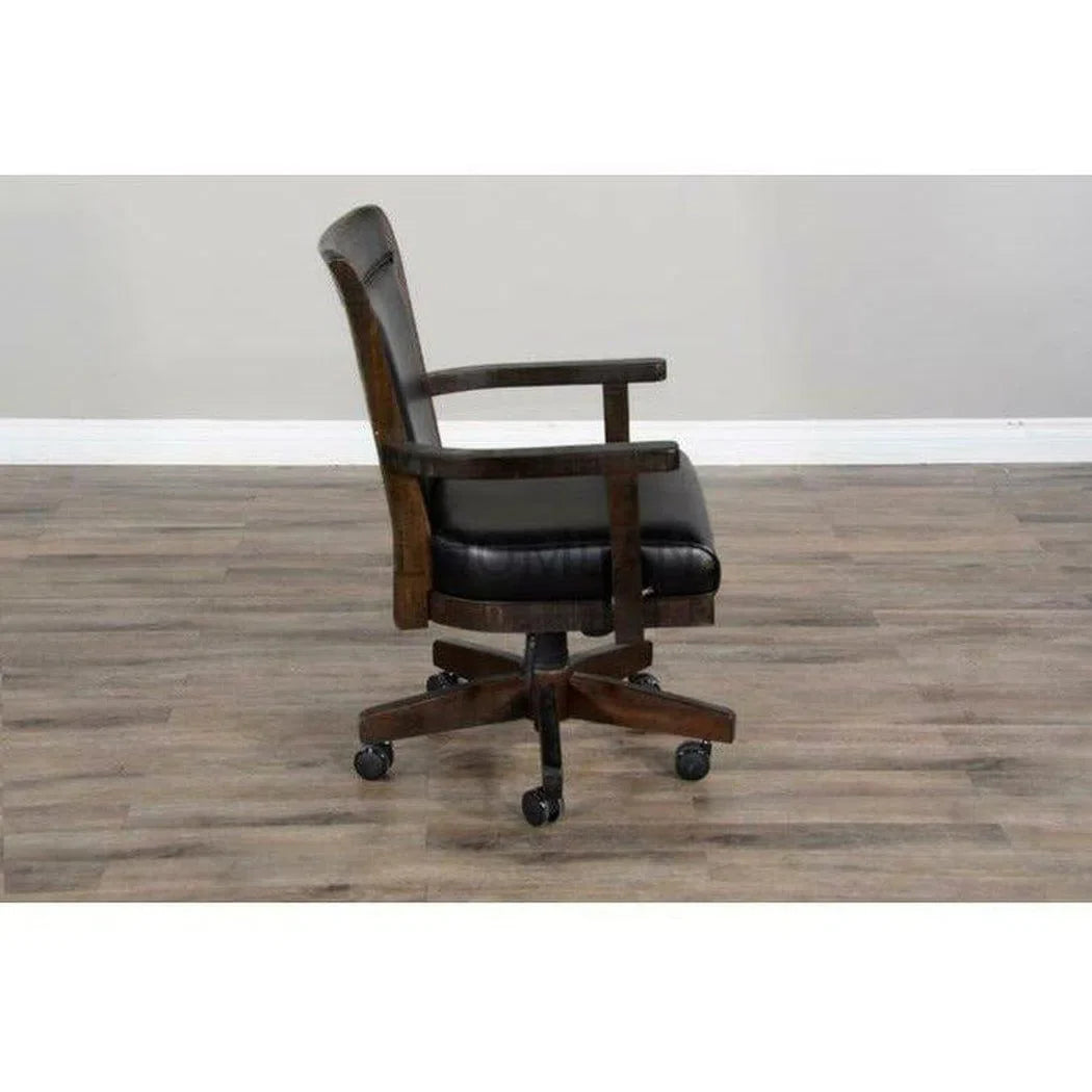 Expertly crafted from the highest quality mahogany, this swivel leather game chair or home office chair adds elegance and practicality to any space. Designed by skilled craftsmen, it boasts a rich, dark brown color with a tobacco leaf finish. With an overall dimension of 24 x 23 x 38, it's sure to bring years of reliable service.