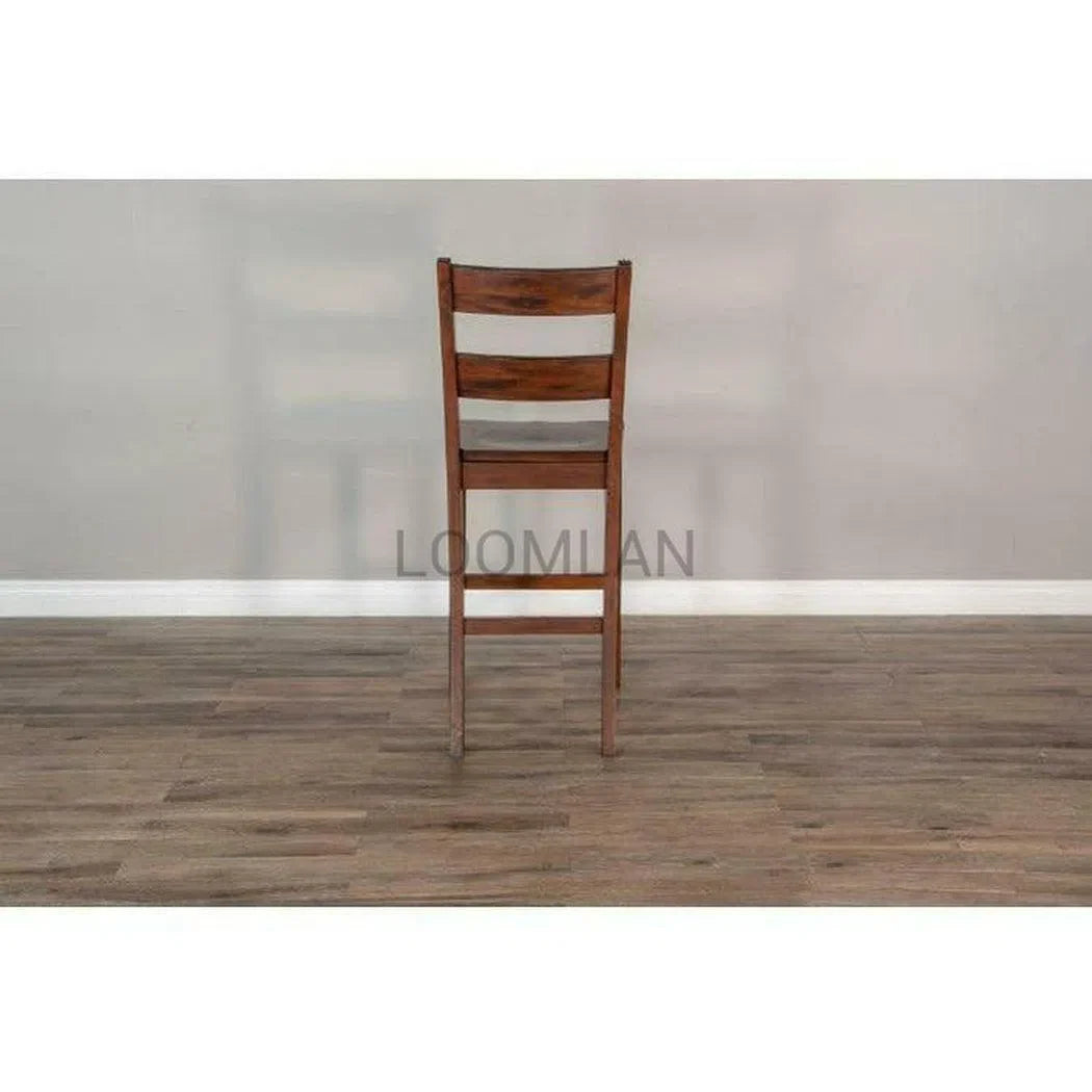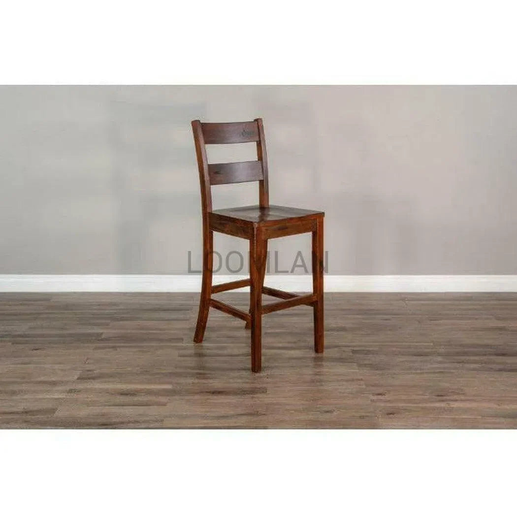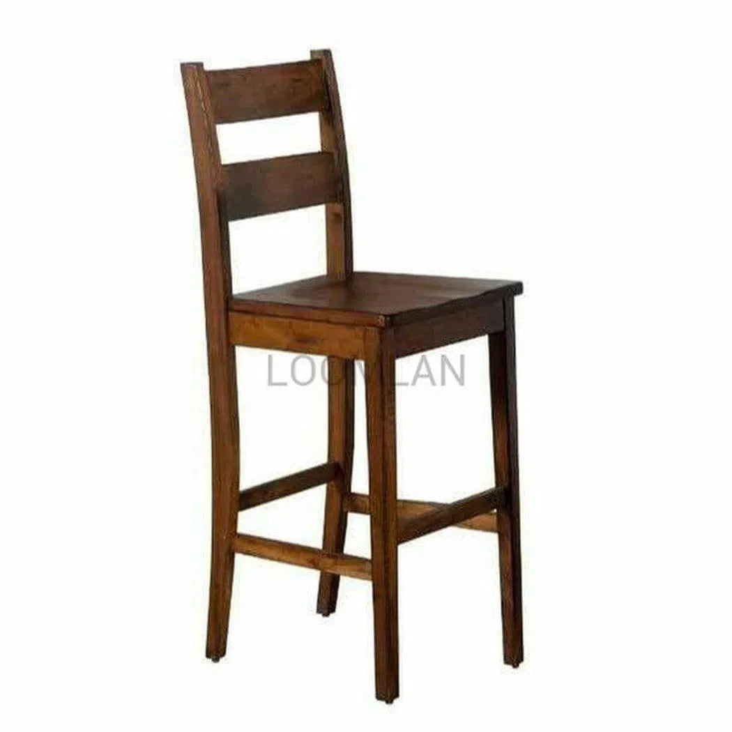 Elevate your home with the rugged charm of our Tuscany Collection. Our 30" Rustic Modern Tuscany Ladderback Barstool with Wood Seat boasts sturdy Mahogany construction. The collection features plenty of rustic details, like a planked table top, flared legs with mortise and tenon joinery, metal link details, and a distressed brown finishes all balanced by the modern appeal of its simple lines and uncomplicated look.
