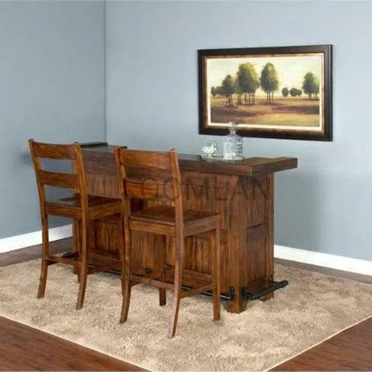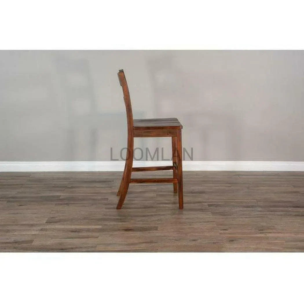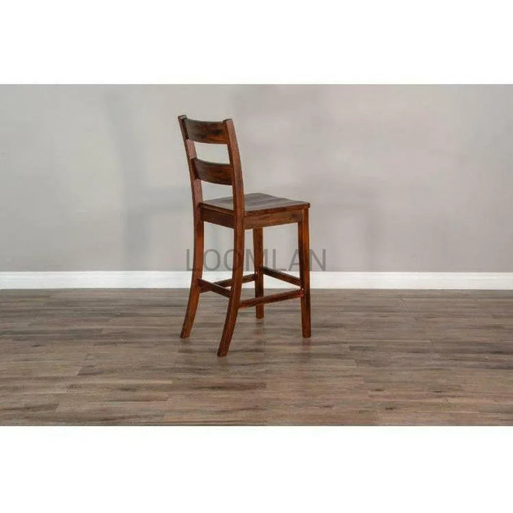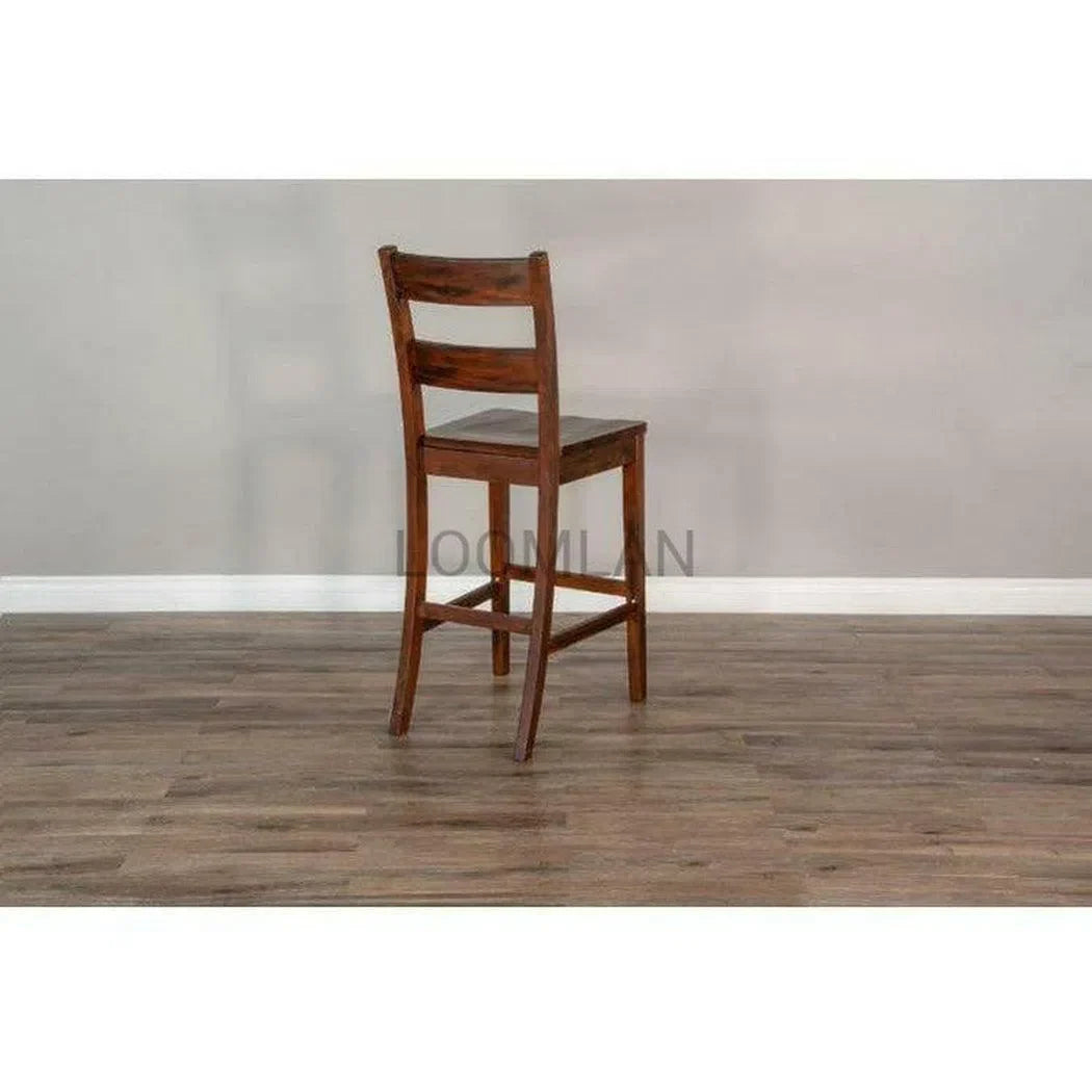 Elevate your home with the rugged charm of our Tuscany Collection. Our 30" Rustic Modern Tuscany Ladderback Barstool with Wood Seat boasts sturdy Mahogany construction. The collection features plenty of rustic details, like a planked table top, flared legs with mortise and tenon joinery, metal link details, and a distressed brown finishes all balanced by the modern appeal of its simple lines and uncomplicated look.