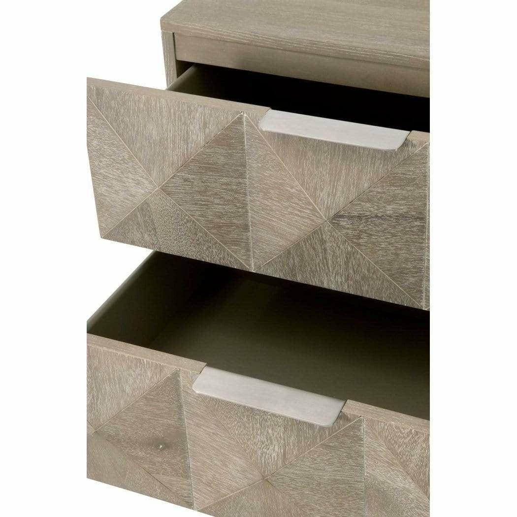 Discover the luxurious and sophisticated Scandinavian Bedroom Atlas 2-Drawer Nightstand, a standout piece from our exclusive Tradition Collection. Its Raised Diamond pattern and Natural Gray finish, complemented by a Brushed Stainless Steel base, exude elegance and elevate any bedroom. Each nightstand is one-of-a-kind, with natural knots and imperfections adding to its rustic charm. Embrace the unique transitional design and natural variations of this stunning nightstand, featuring Raised Diamond pattern door panels and a sandblasted Acacia Veneer finish that accentuates the wood's natural grain and texture. As with any natural material, expect to see knots, cracks, scratches, and marks on the surface, which only add to its character and uniqueness. Rest assured, no claims are necessary, and this exquisite finish will remain beautiful for years to come with proper care.