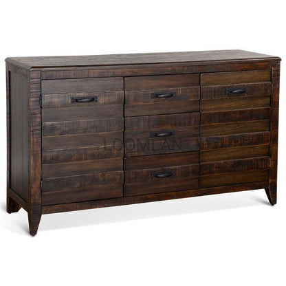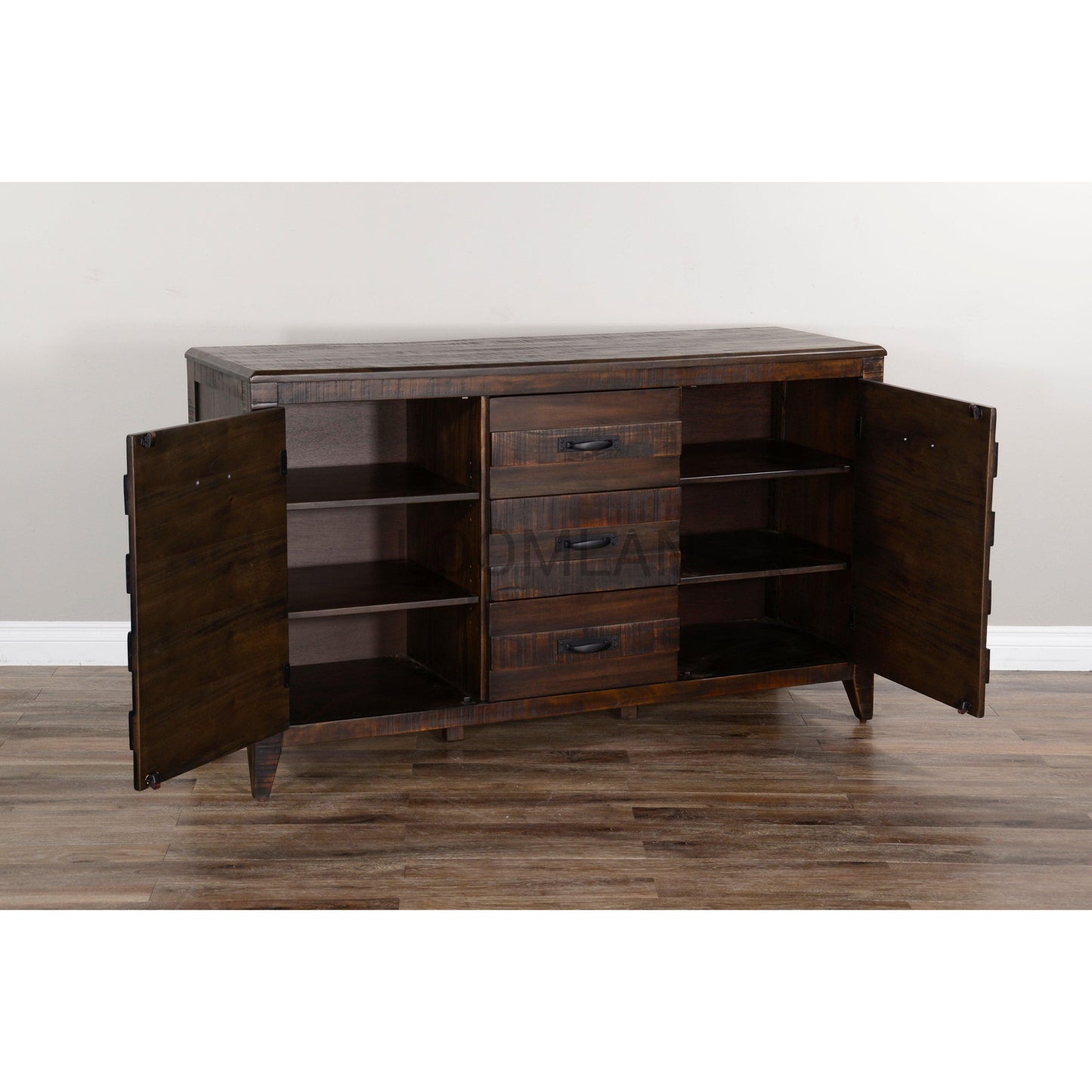 As a product expert in furniture, I confidently present to you our 60" Dark Brown Wood Dining Server Buffet Sideboard. The sturdily built piece boasts a timeless Dark Toast finish and wood grain details, adding elegance to any setting. With two side cabinets and 3 centered drawers, it offers ample storage space. Made from rough sawn mahogany wood, it is built to last. Assembly required.