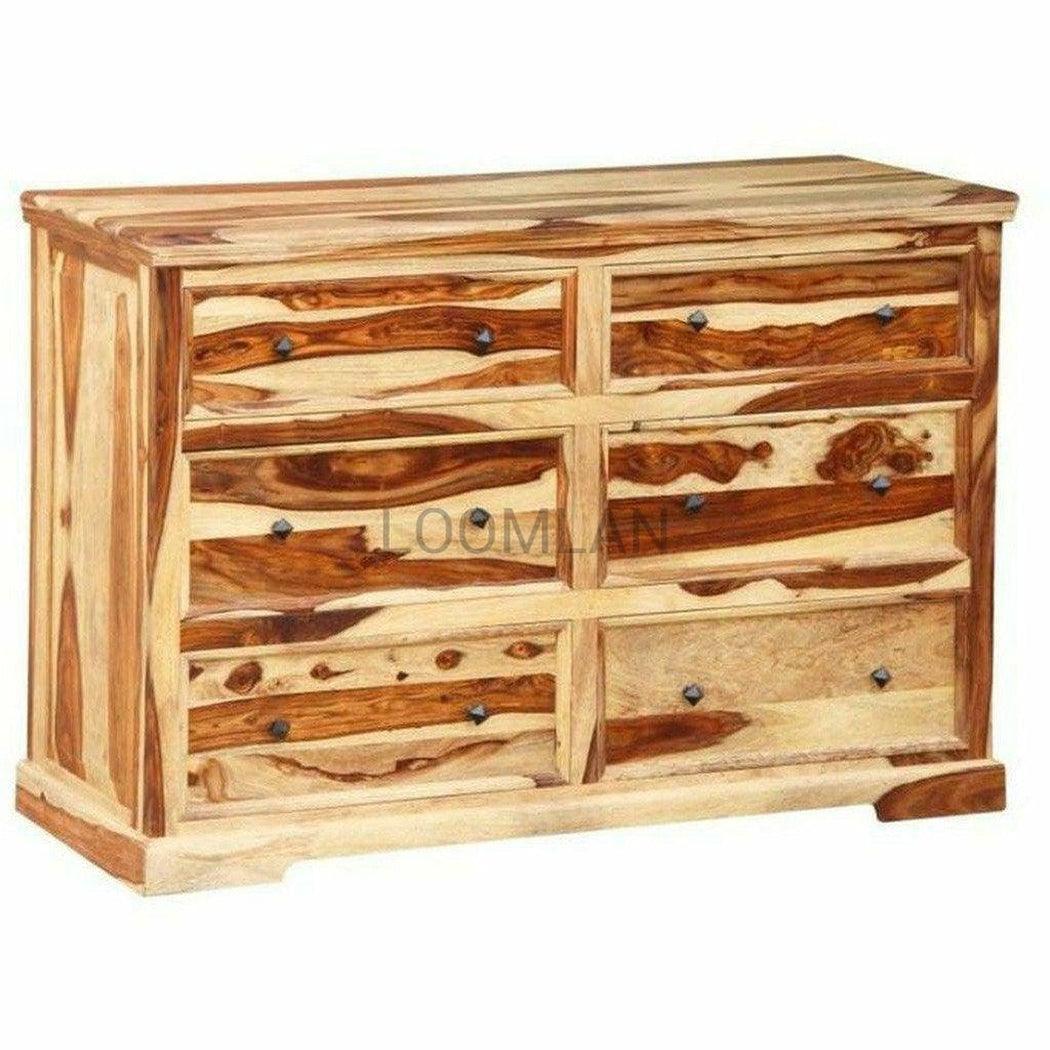 Elevate the sophistication of your bedroom or guest room with our Rustic Farmhouse Double Dresser. Made from water-resistant Sheesham timber, this dresser features panel detailed sides and a notched base for an elegant touch. Organize your clothing and linens in the 6 spacious drawers, while using the top surface to display your most cherished items. Experience the luxurious and exclusive charm of our dresser. This rustic farmhouse double dresser boasts a Sheesham timber construction with a water-resistant lacquer exterior.