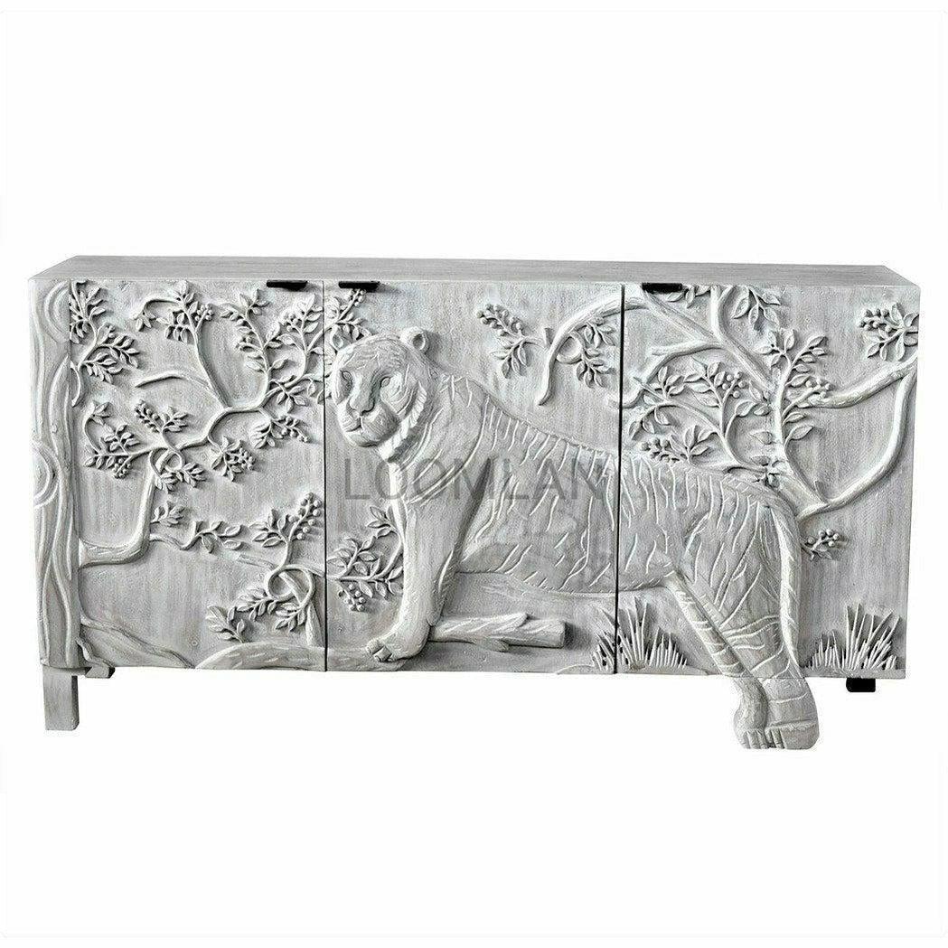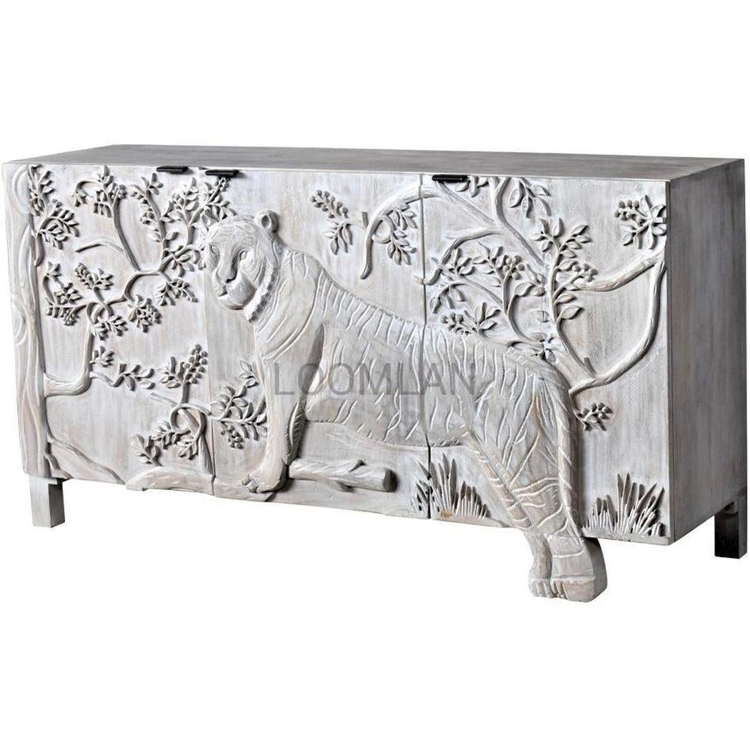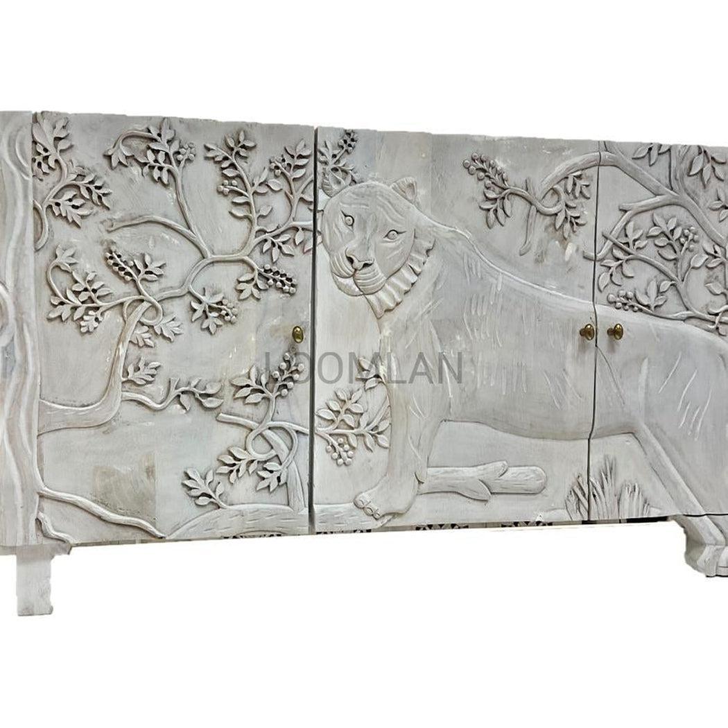 Mother Nature 60" White Solid Wood Sideboard Hand Carved Tiger Front Doors Features