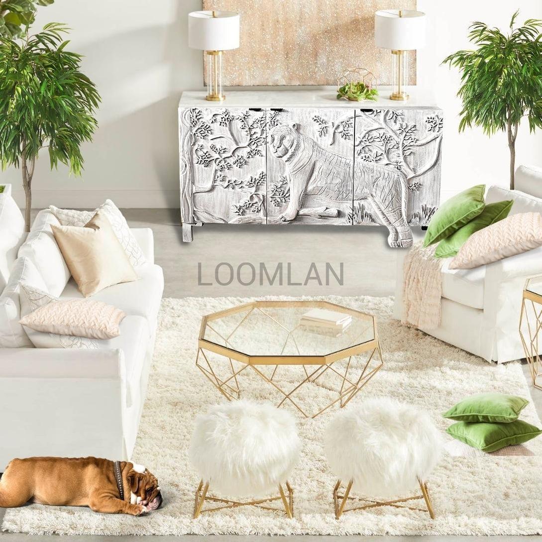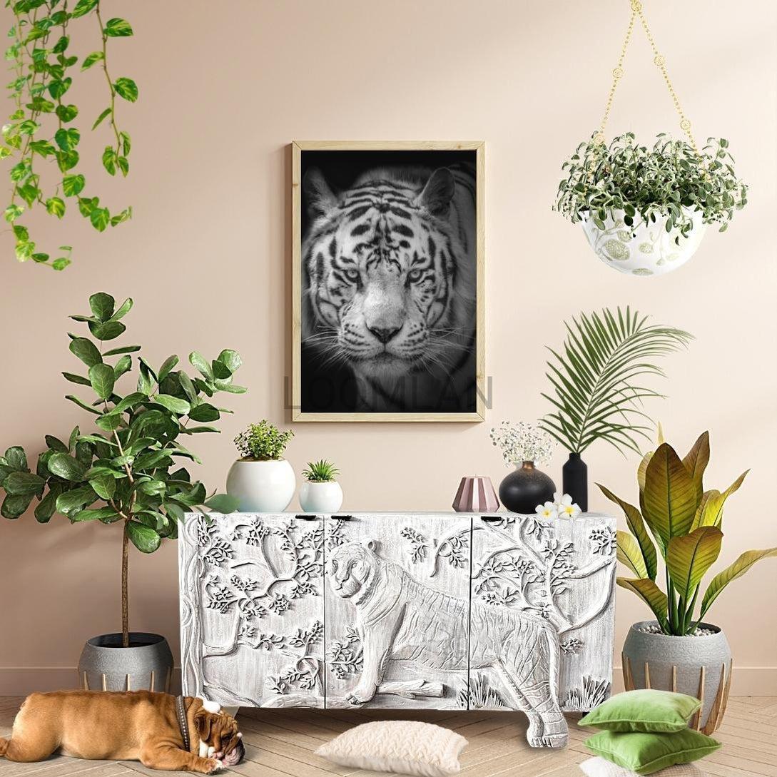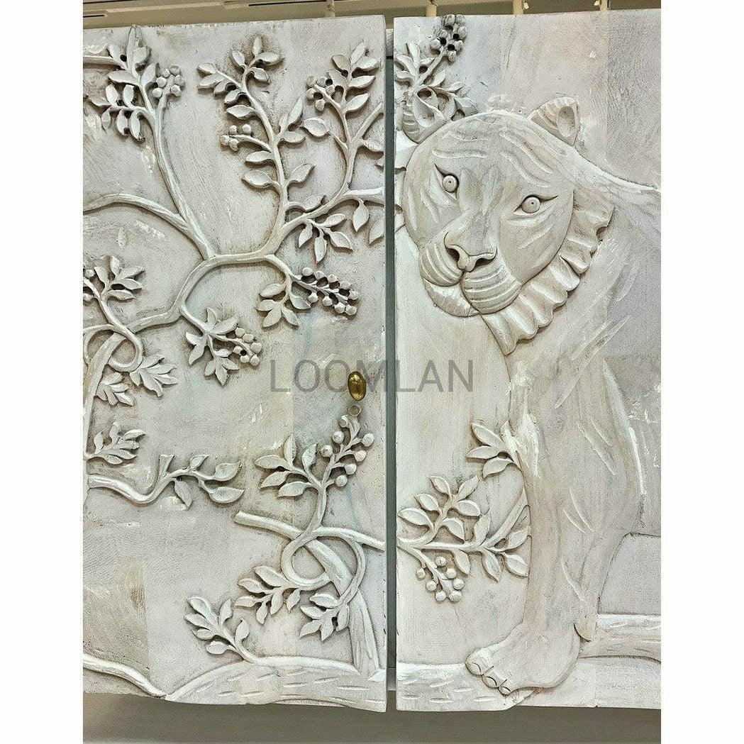 Mother Nature 60" White Solid Wood Sideboard Hand Carved Tiger Front Doors Features