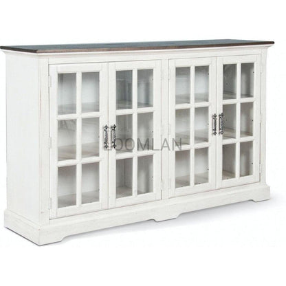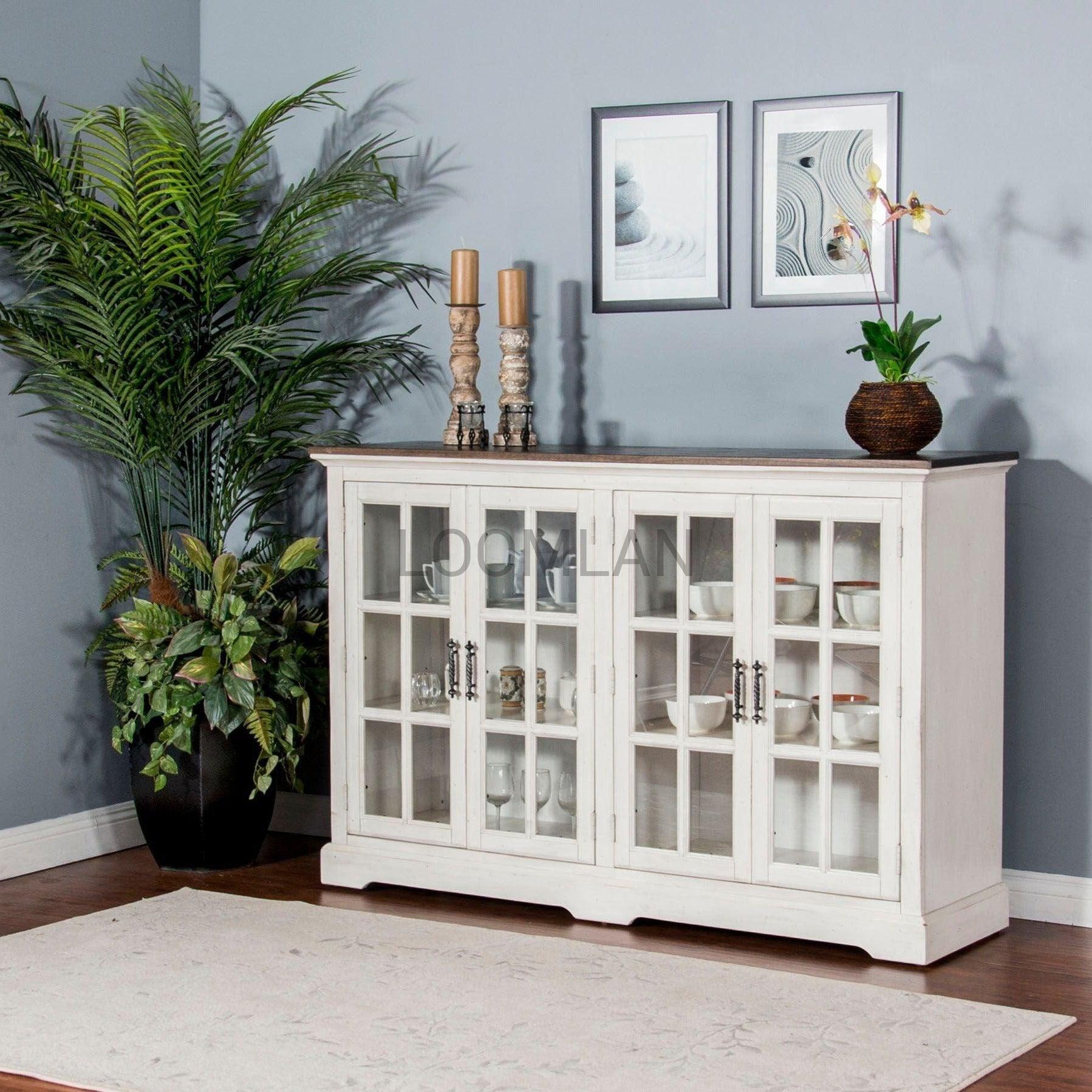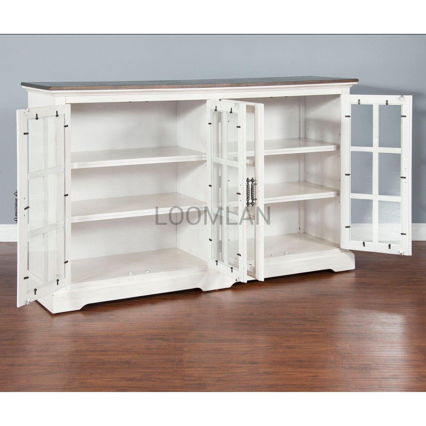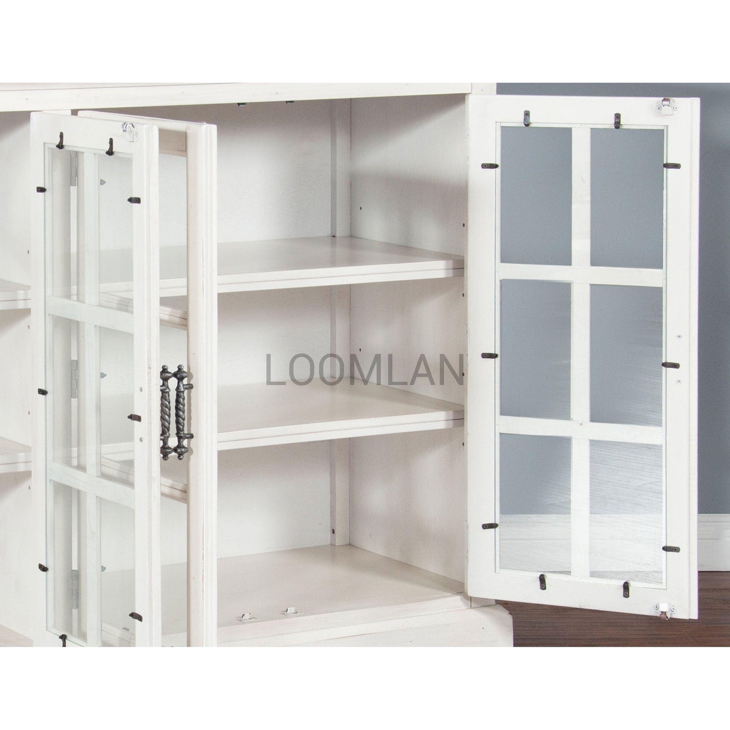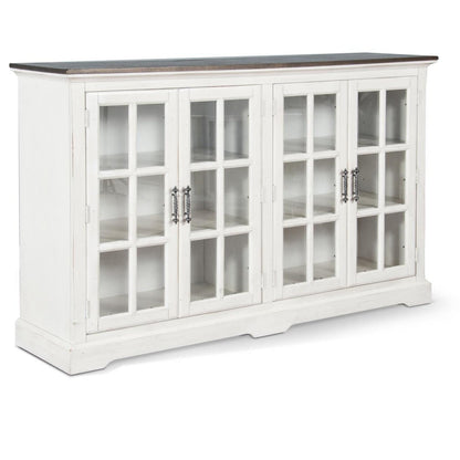 69" White Wood Buffet Server With Windowpane Glass Doors Curio Cabinet Features: