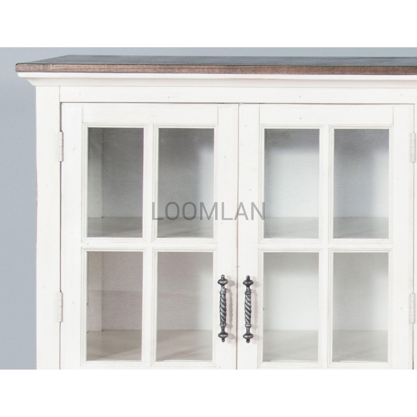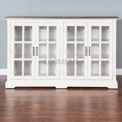 This beautiful White Buffet Server With Windowpane Glass Doors Curio Cabinet has a timeless old-world charm. Constructed with Mindi and mahogany solids and veneers, with glass doors and adjustable shelves.
