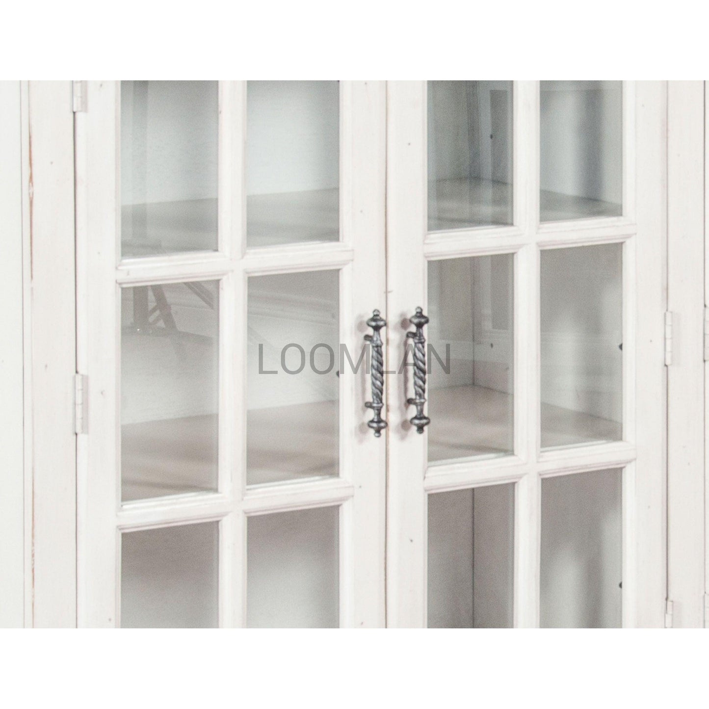 This 69" White Buffet Server With Windowpane Glass Doors Curio Cabinet is constructed with durable mindi and mahogany solids and veneers, lending a touch of old-world charm to any space. Featuring adjustable shelves and a heavy, sturdy design, this cabinet offers both style and functionality. Assembly required.