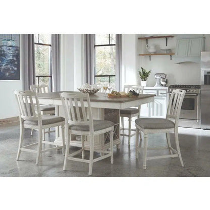 Crafted by an industry expert, the Panama Jack Sonoma dining table with storage is a must-have for any space, blending traditional cottage design with a modern twist. Its two-tone finish of wire-brushed grey and antique weathered white, along with soft rounded corners and tapered turned feet, lends a casual elegance and charming appeal. With ample room for storage and a sophisticated design, the Panama Jack Sonoma counter height table is a top choice for customers seeking a combination of classic and modern aesthetics.
