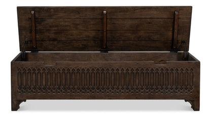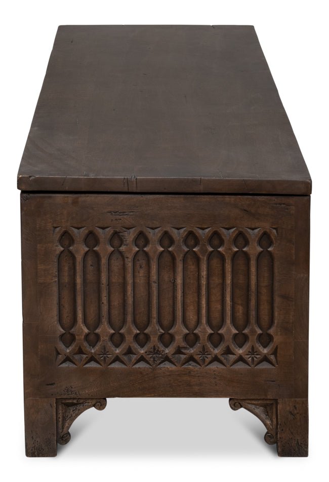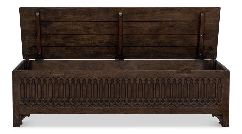 This storage bench is not only beautiful but also practical. The hinged top lid opens to reveal ample storage space, perfect for keeping blankets, pillows, or other essentials neatly tucked away. The Aarush Trunk's thoughtful design ensures it can serve multiple purposes, whether placed in a hallway to greet guests or used as a statement piece in a bedroom. Its robust construction and ornate details make it a lasting addition to any home, providing both beauty and utility.