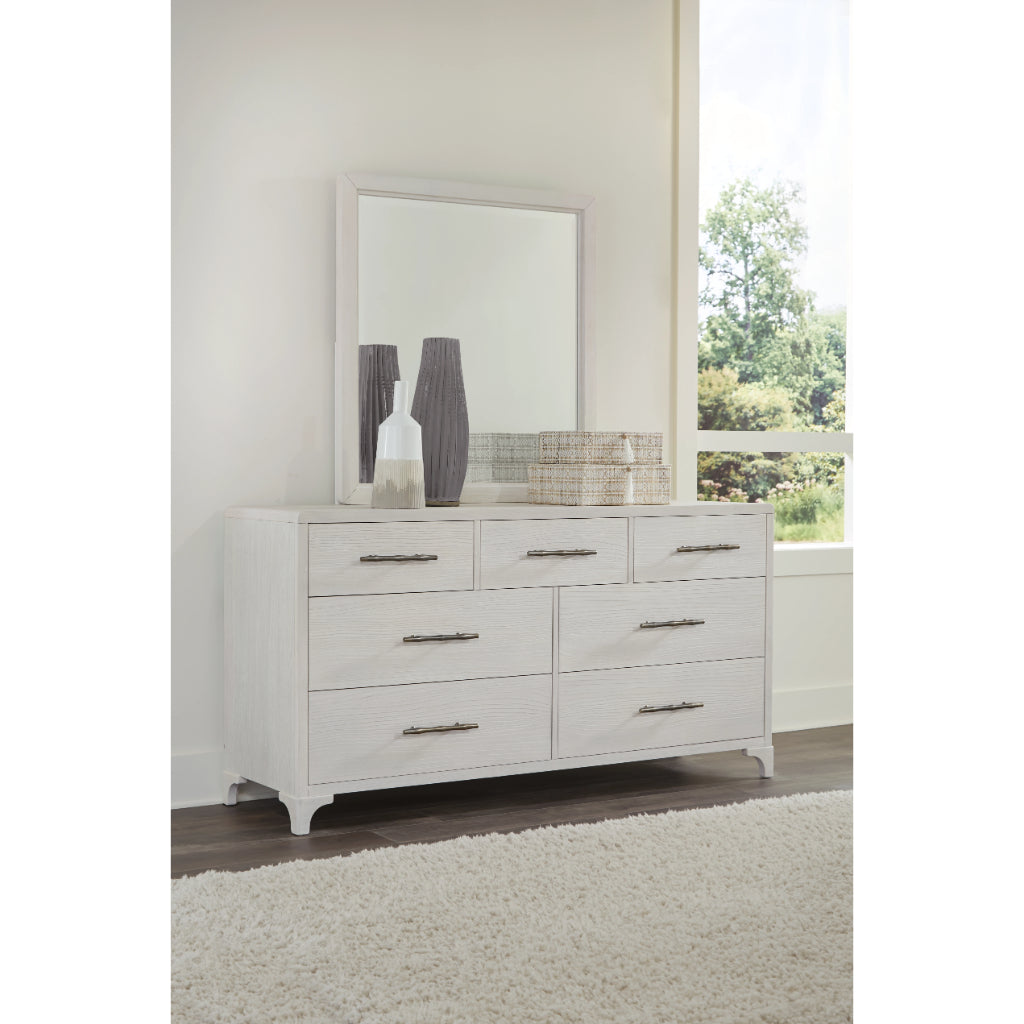 The Abaco Upholstered Bed 4-Piece Set combines contemporary elegance with functional design, featuring a heavy wire-brushed oak veneer in a crisp white finish. The bed’s low-profile frame is complemented by a wide flange headboard upholstered in durable, textured performance fabric, offering both comfort and style. Available in Queen and King sizes, it serves as the sophisticated focal point of the set. Mattress and box spring are sold separately. The set includes a bed, seven-drawer dresser, mirror, and nightstands—all constructed with English dovetail joints and full-extension metal side-mounted glides. Drawers feature custom silver hardware for smooth operation and refined aesthetics. Each nightstand offers a drawer, open shelf, and built-in USB charging ports to keep your devices powered and essentials organised. This set expertly balances elegance, storage, and technology to enhance any bedroom.
