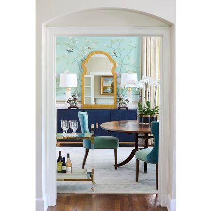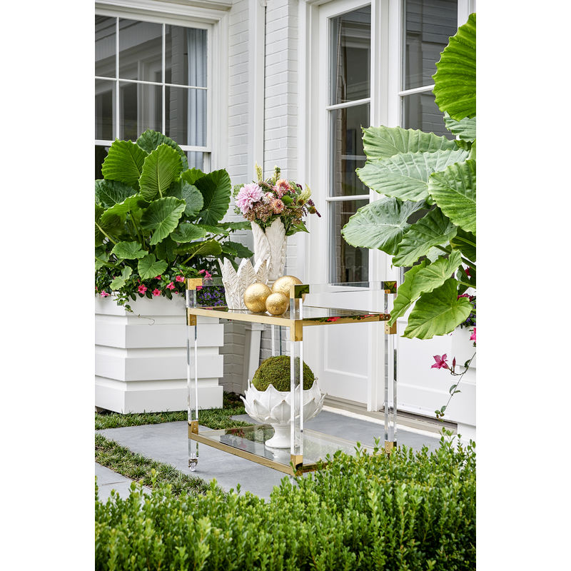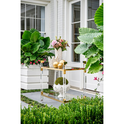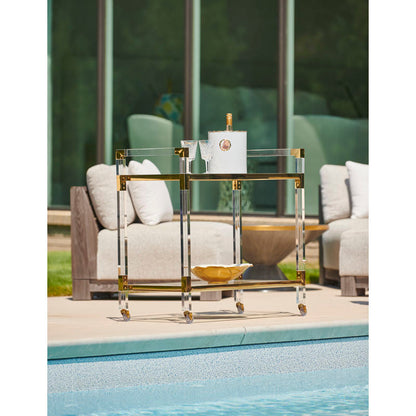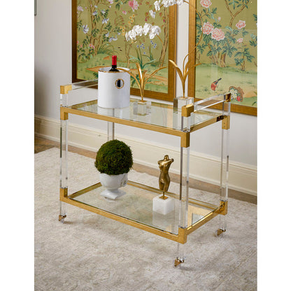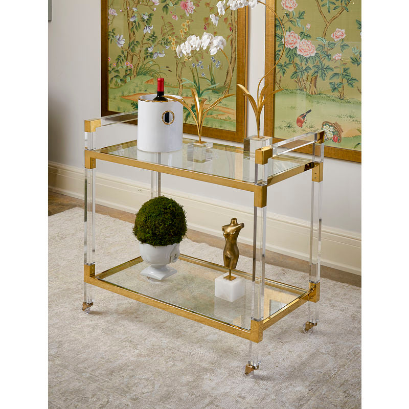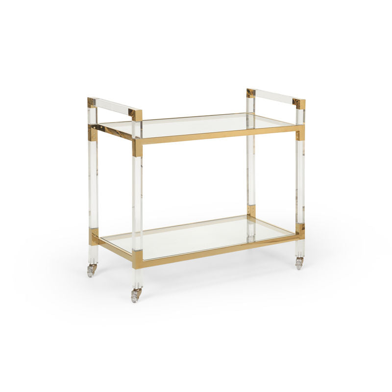 Elevate your entertaining space with this elegant bar cart. This cart features a gold frame with clear acrylic sides, offering a modern touch that suits any decor. The design includes two-tier glass shelving, providing ample space to store and display your favorite beverages and barware. The clear tempered glass shelves are not only stylish but also sturdy, ensuring your items are showcased beautifully. With its polished brass finished iron edging, this bar cart adds a touch of luxury to any room. Designed with functionality in mind, the cart is easy to move around thanks to its wheeled legs. This makes serving guests effortless, whether you're hosting a small gathering or a large party.