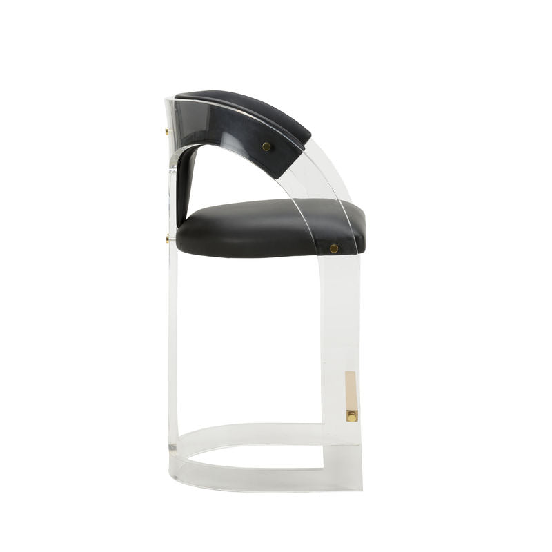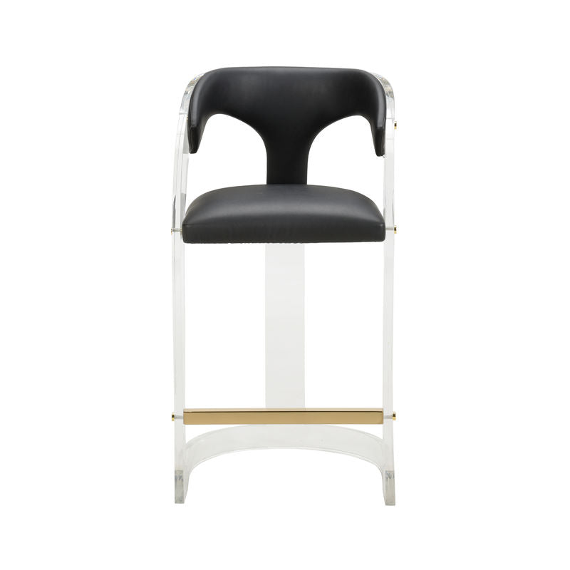 The After Midnight Bar Stool adds a stylish touch to any home or office. With its clear acrylic frame, this stool showcases a modern and sleek design. It's perfect for those who love contemporary style. The curved shape of the stool ensures a comfortable seating experience. The polished brass footrest not only adds a bit of luxury but also provides support while sitting. This piece is part of the Wildwood collection, known for its unique and stylish furniture options. The stool features a soft, black faux leather cushion that enhances comfort. This cushion is designed to blend seamlessly with any decor, making it a versatile choice for various settings.