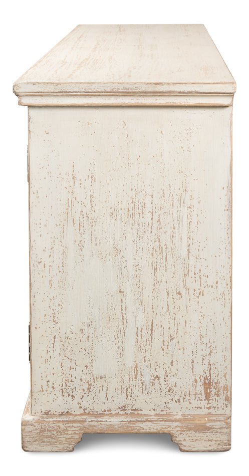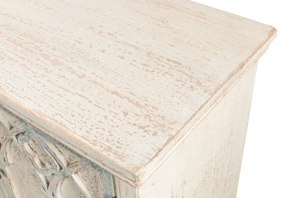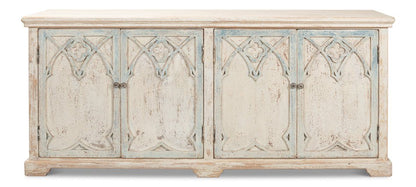 The Alambra Sideboard is a charming piece that brings a touch of history and elegance into any room. Its design features intricate details on the doors that echo the beauty of gothic arches. This sideboard's classic white color is beautifully offset by light blue accents, creating a striking contrast that enhances its antique appeal. The distressed cream finish adds to its vintage look, making it a perfect fit for traditional and rustic styles. Crafted from durable pine, this sideboard promises longevity and sturdiness, ensuring it stands the test of time.