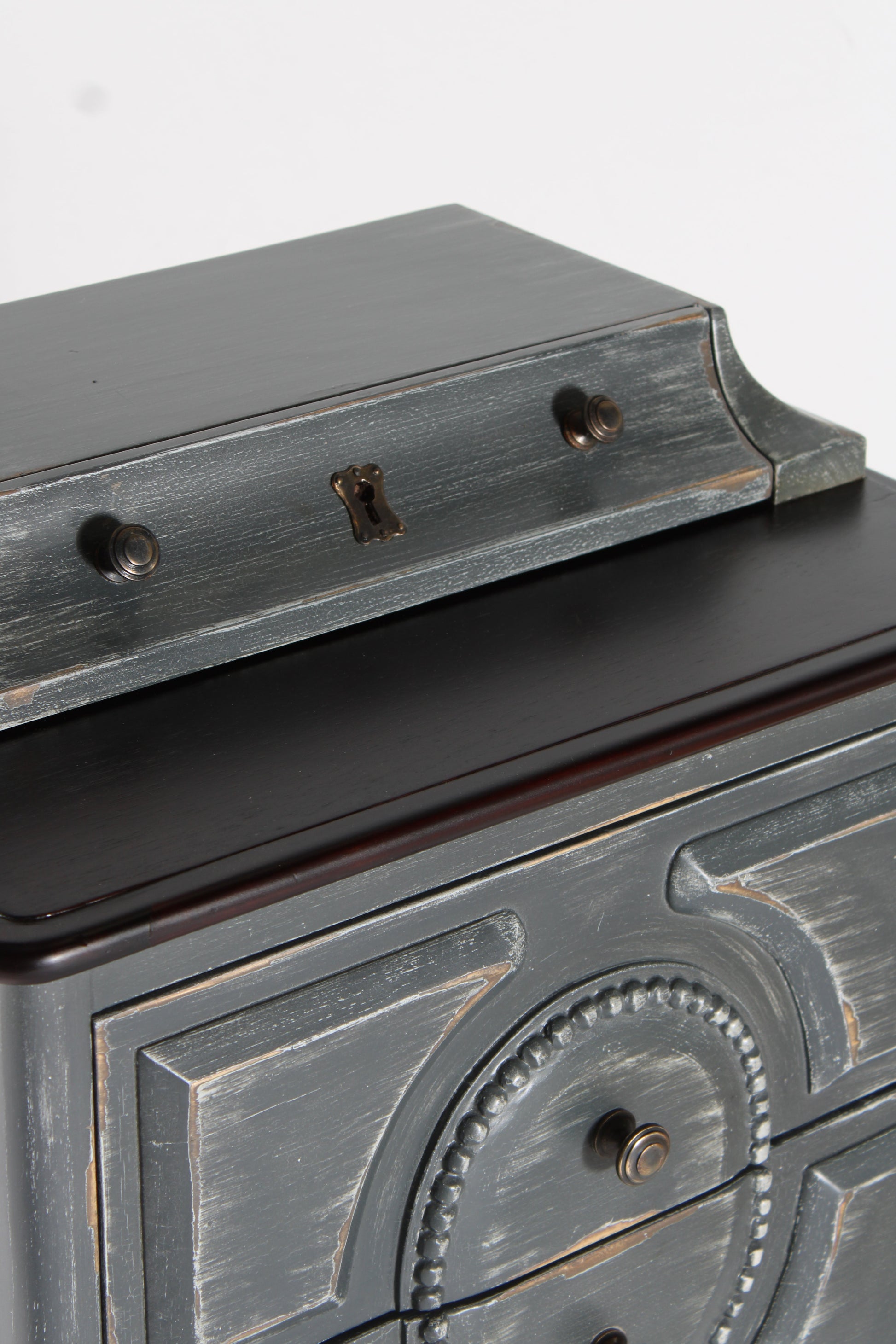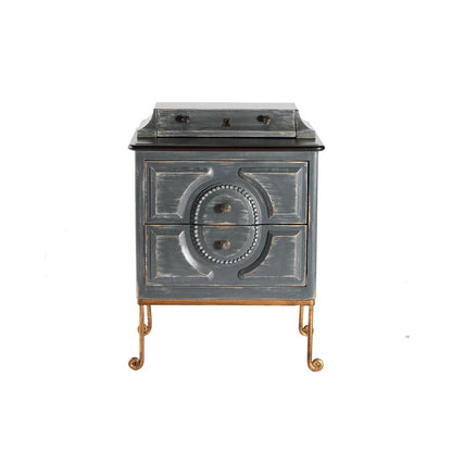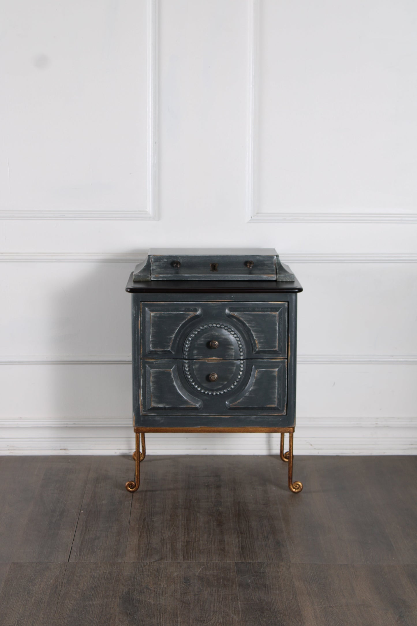 Experience the elegance of French-inspired design with this nightstand. Crafted with attention to detail, it features two spacious drawers and a cleverly hidden third drawer at the top, offering ample storage for your essentials. Its whimsical metal base, finished in a Champagne Metalica color, adds a touch of sophistication to any bedroom decor. This nightstand is thoughtfully designed to complement high sitting mechanical mattresses, ensuring both style and convenience in your space.