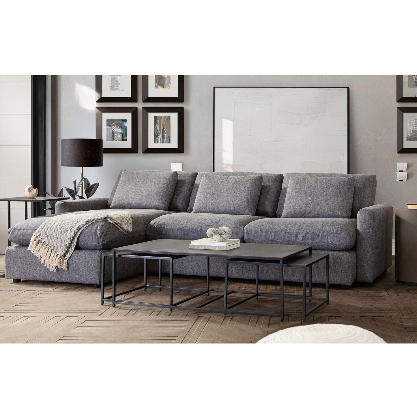 Meticulously crafted with impeccable tailoring, feather down seating, and a luxurious grey polyester fabric, this reversible Chaise Sectional exudes sophistication and style. With its sleek lines and deep feather down seating, this piece adds a touch of indulgence to any room. The LF or RF configuration offers maximum flexibility, adapting to your home's unique layout.