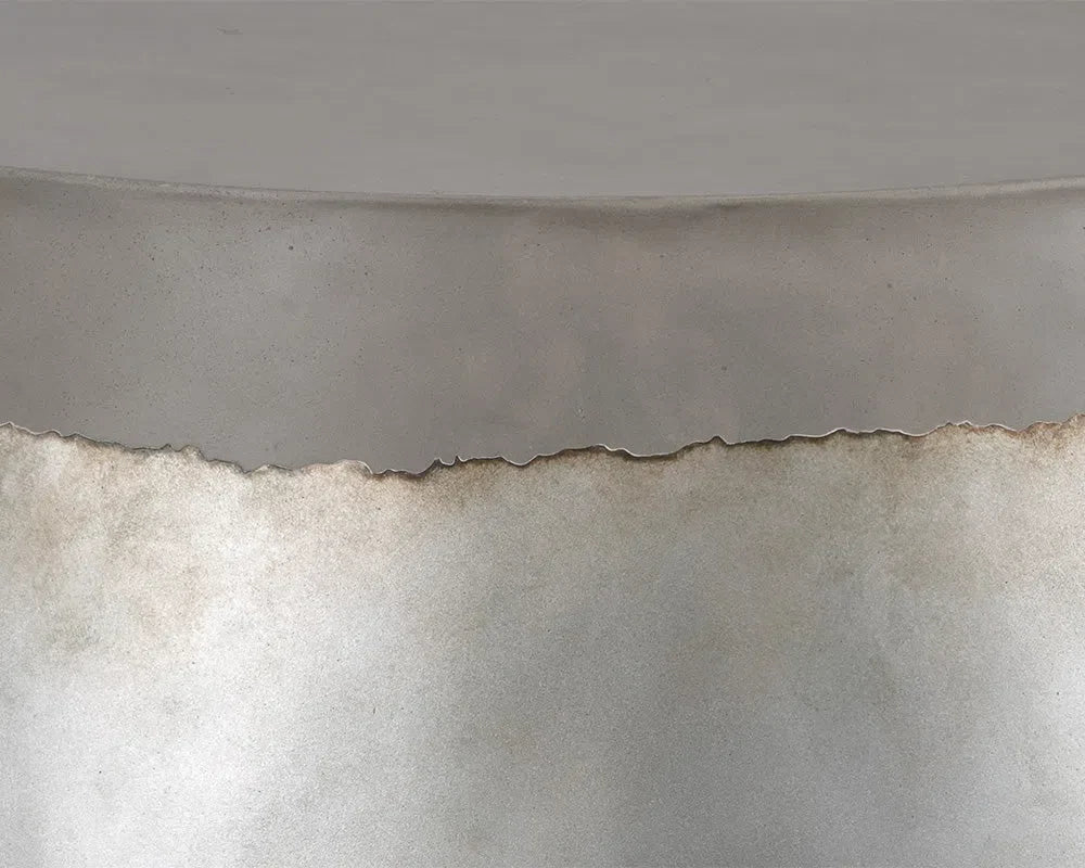 A beautiful concrete coffee table that will add boldness to any space. The drum-shaped design features a dramatic painted black ombre and silver foil accents that pair perfectly with the industrial grey concrete. A versatile and functional piece. Elevate your outdoor space with the striking Aries Concrete Outdoor Round Coffee Table. This unique drum-shaped design boasts a bold black ombre and shimmering silver foil accents, perfectly complementing the industrial grey concrete. Not only does it add a touch of style, but it's also versatile and functional, making it a must-have for any outdoor space.