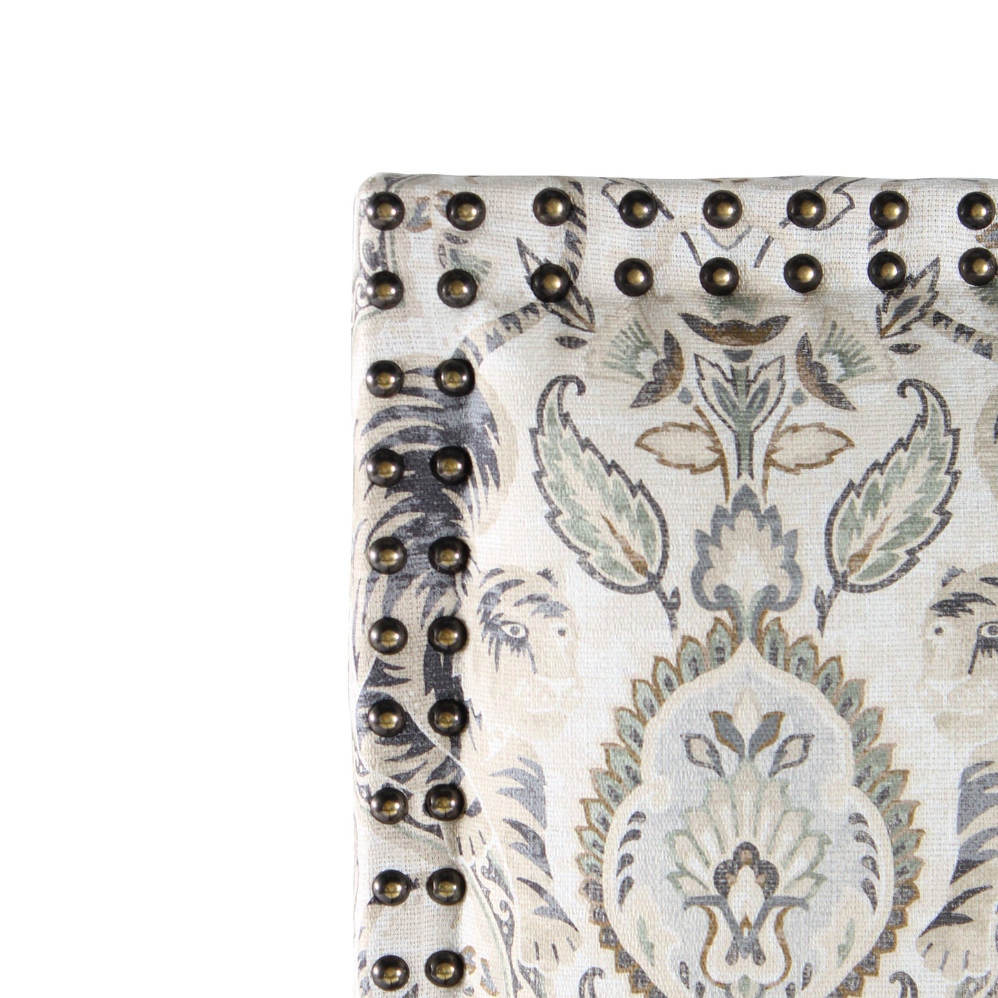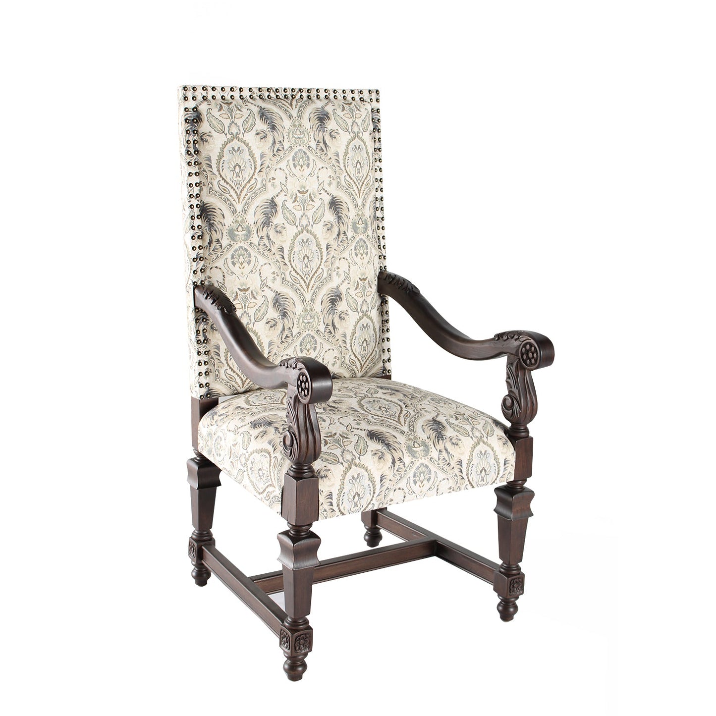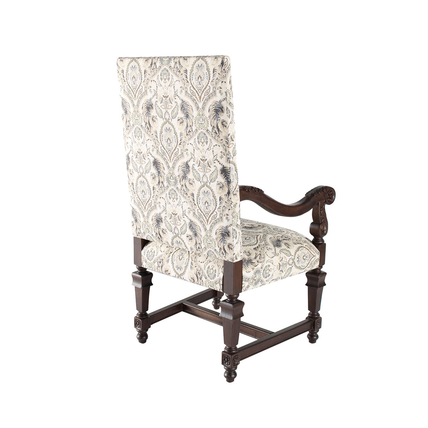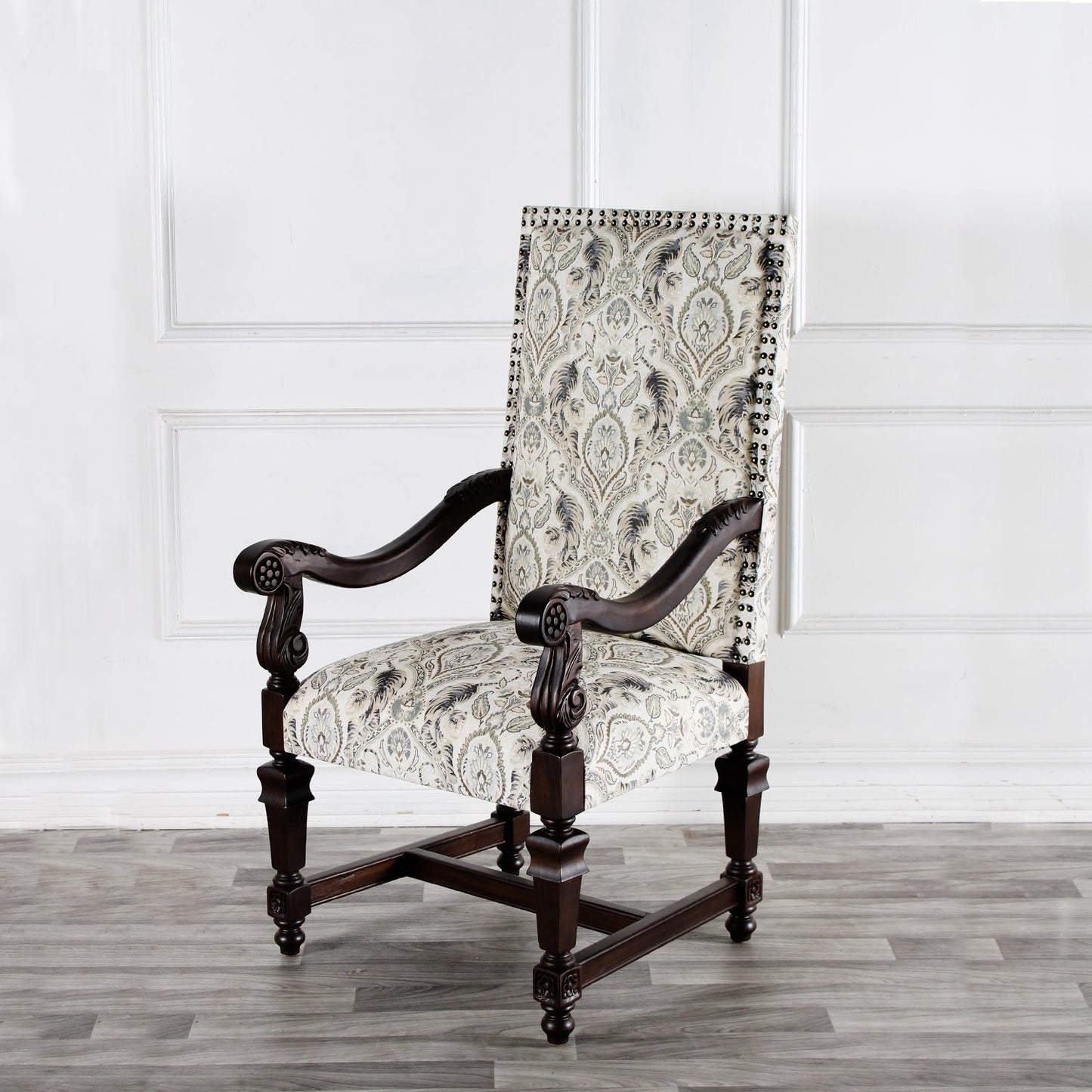 This armchair is designed to combine style and comfort effortlessly. The dark wood frame and carved armrests reflect a commitment to quality and attention to detail. The high-profile design, featuring ornate carvings and nailhead trim, enhances its traditional appeal. The beige upholstery with a floral pattern complements the rich walnut finish, offering a versatile piece that can fit seamlessly into various interior styles.