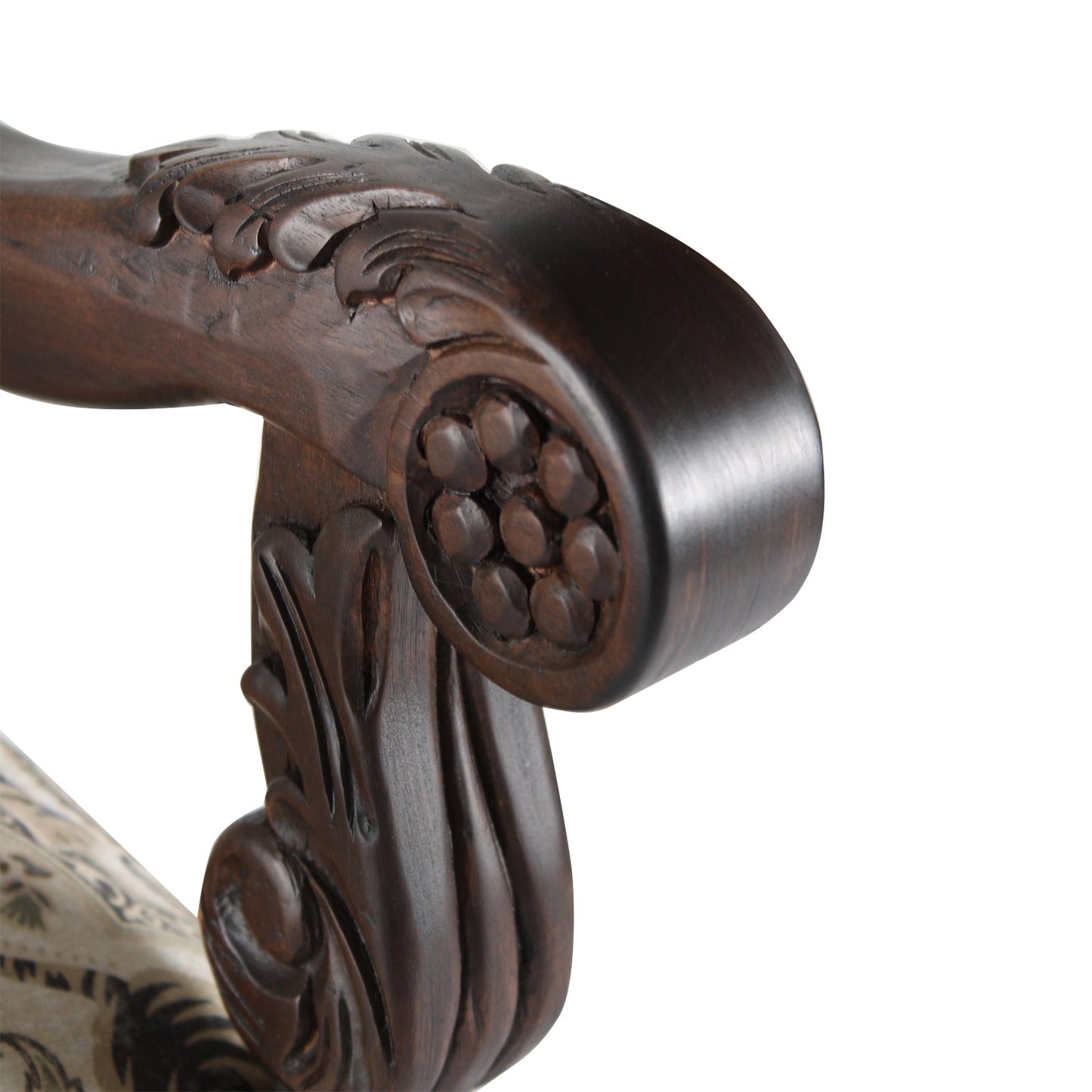 The Mayorca armchair brings a touch of traditional Spanish Colonial elegance to any room. Crafted from hardwood, this armchair is enriched with hand-carved details and a smooth walnut finish. Its generous proportions offer a comfortable seating experience, making it an inviting spot for relaxation. The fun tiger print upholstery adds a unique flair, ensuring this classic piece stands out as a must-have addition to your home decor.