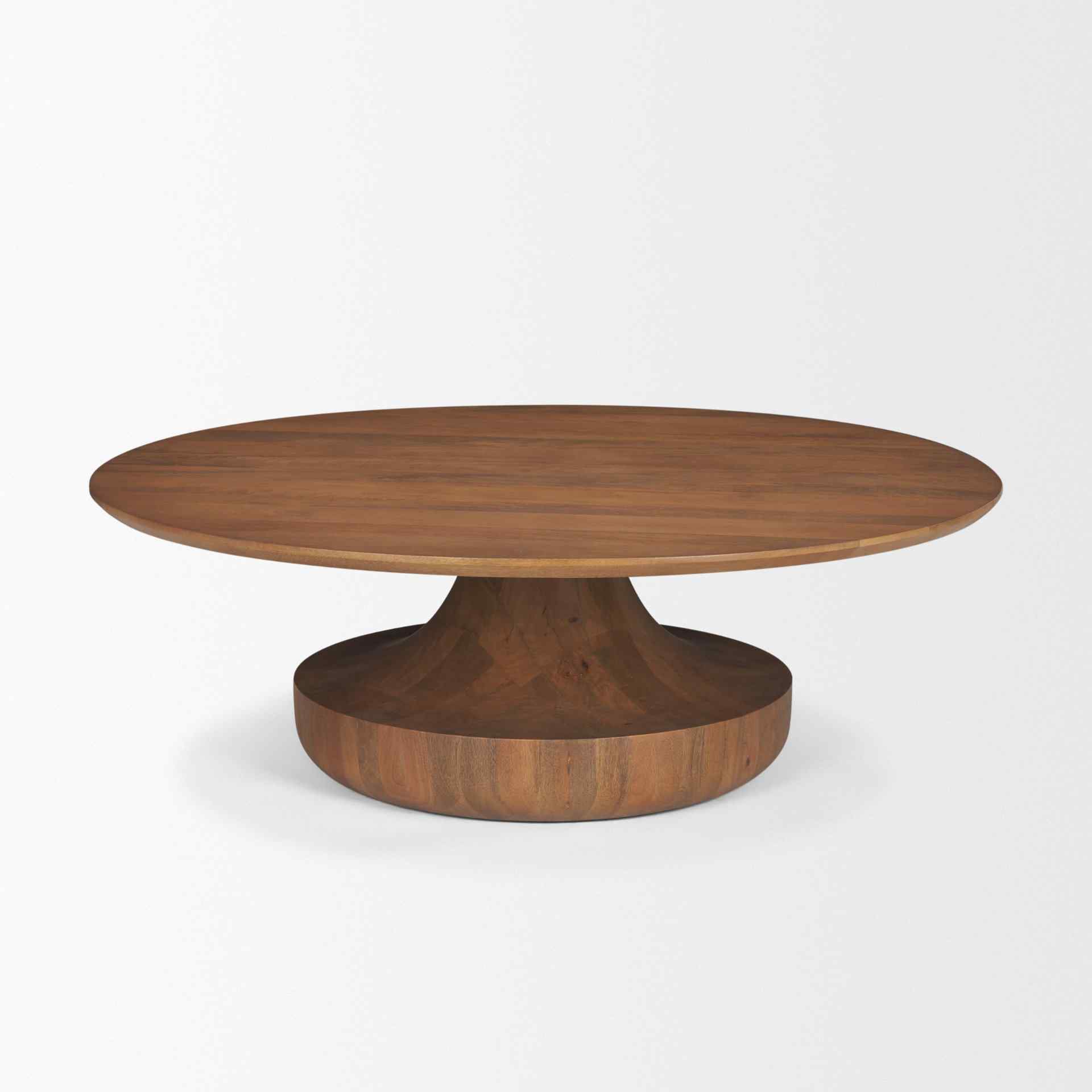 The Arno Coffee Table brings a stylish touch to any living room with its elegant design. Made from solid medium brown mango wood, it features a round top that rests on a sculpted pedestal base, creating a look that feels both grounded and artistic. The warm mid-brown tone adds a cozy feel to spaces, seamlessly blending contemporary style with natural elements. Its solid wood construction ensures durability while the sculptural base adds a unique flair that catches the eye. This coffee table is perfect for those who appreciate both form and function in their home furnishings.