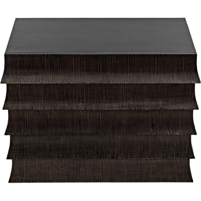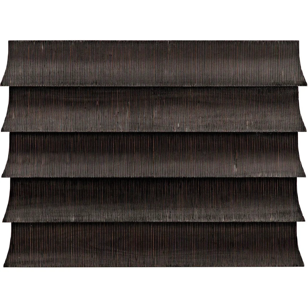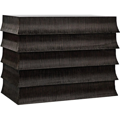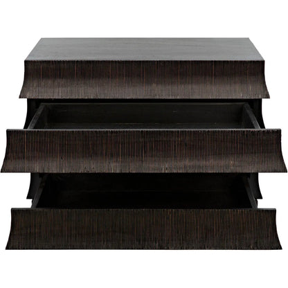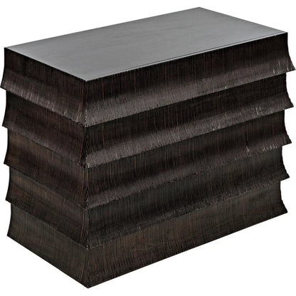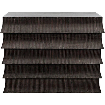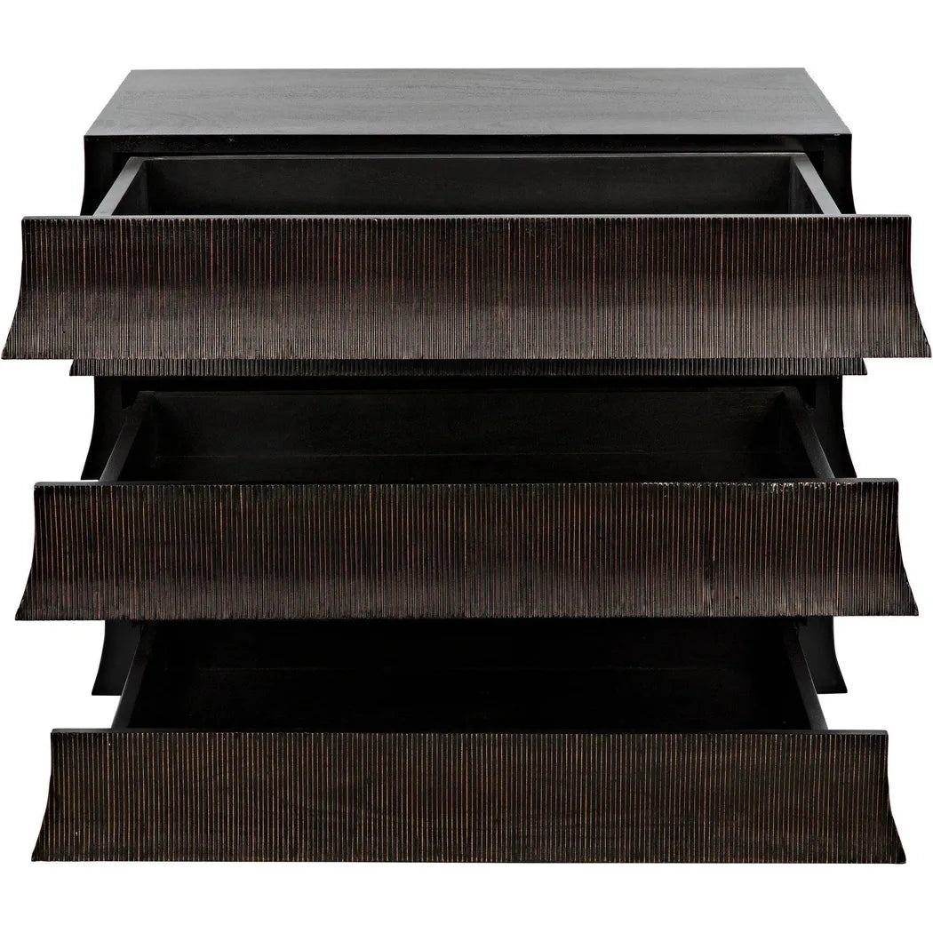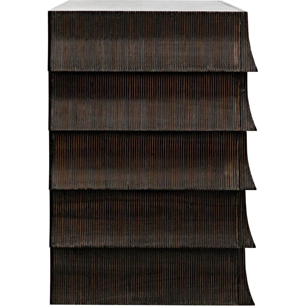 Upgrade your bedroom with the elegant and timeless Ava Wood Black Dresser. Hand carved from luxurious mahogany, this 5-drawer piece showcases intricate details inspired by 1930s fashion icons. The ruffled carvings and hand rubbed black finish with light brown highlights make it a true standout piece. Add a touch of sophistication to your space. Ruffled carvings inspired by the dresses worn by flappers in the 1930s elevate the 5-drawer Eva dresser far above the ordinary. Hand carved of mahogany; it is finished in a hand rubbed black with light brown highlights.