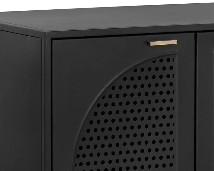 This nightstand offers timeless elegance with its streamlined composition. Crafted with a black metal frame and completed with brass handles, it adds a touch of sophistication to any bedroom. The nightstand features open shelving and two cabinets with arched perforated metal designs, providing both style and functionality. Made in India, this piece showcases refined craftsmanship brought to life by skilled local artisans. By nature, the materials develop unique imperfections such as markings and color variations, making each piece truly one-of-a-kind.