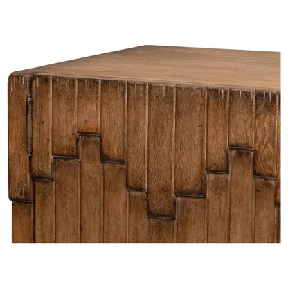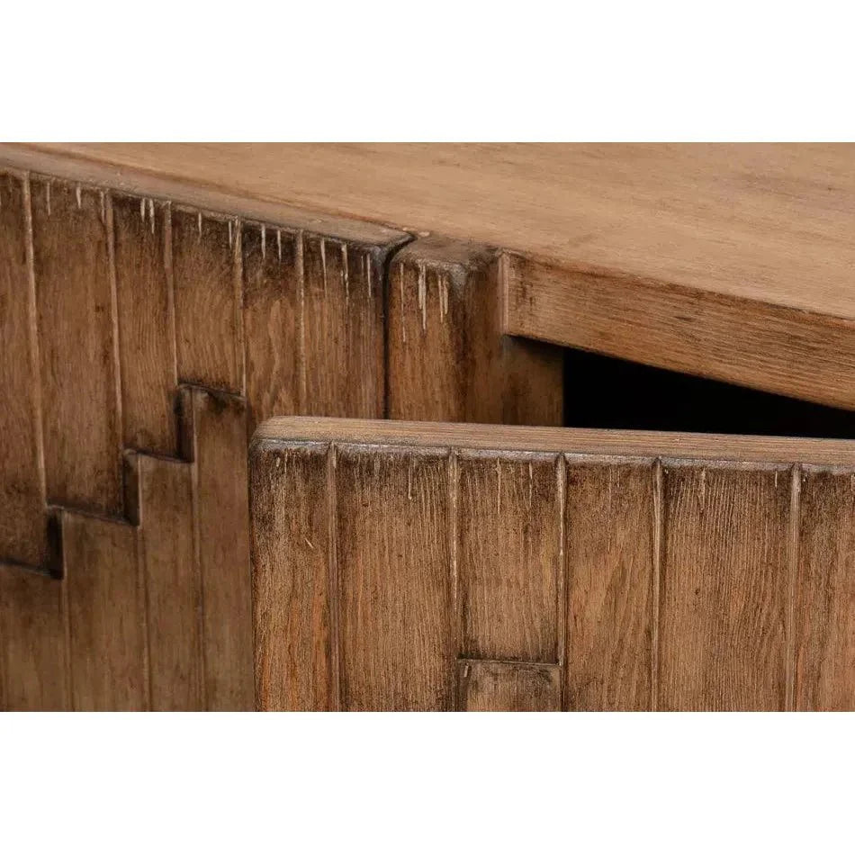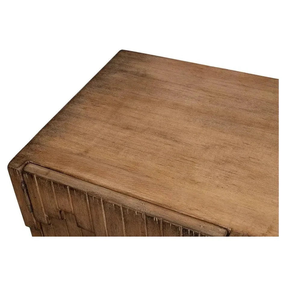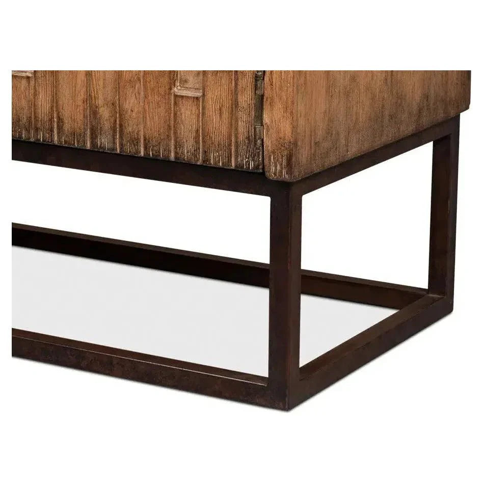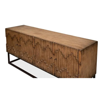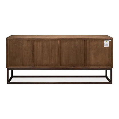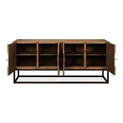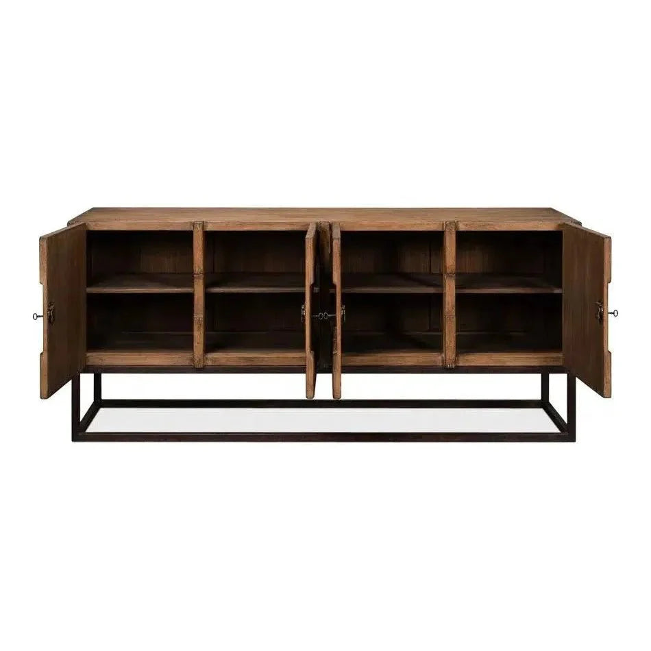 Combining refined cottage style with an artistic edge, the Aztec Brown Sideboard from this merchant's collection stands atop a Reclaimed Wood base for vertical storage. Two woven rattan door fronts conceal two interior shelves, providing ample space for barware, linens, and dining accessories. The weathered brown finish highlights the natural imperfections of the wood, adding to the rustic charm of the piece. By mounting the sideboard on its stand, this credenza creates the illusion of an artistic barn door without any need for wall modifications. Versatile, stylish, and unique, this Aztec Sideboard is a true statement piece that will elevate any dining room.