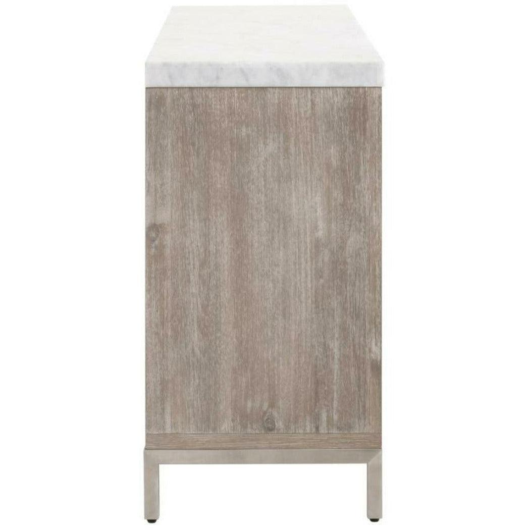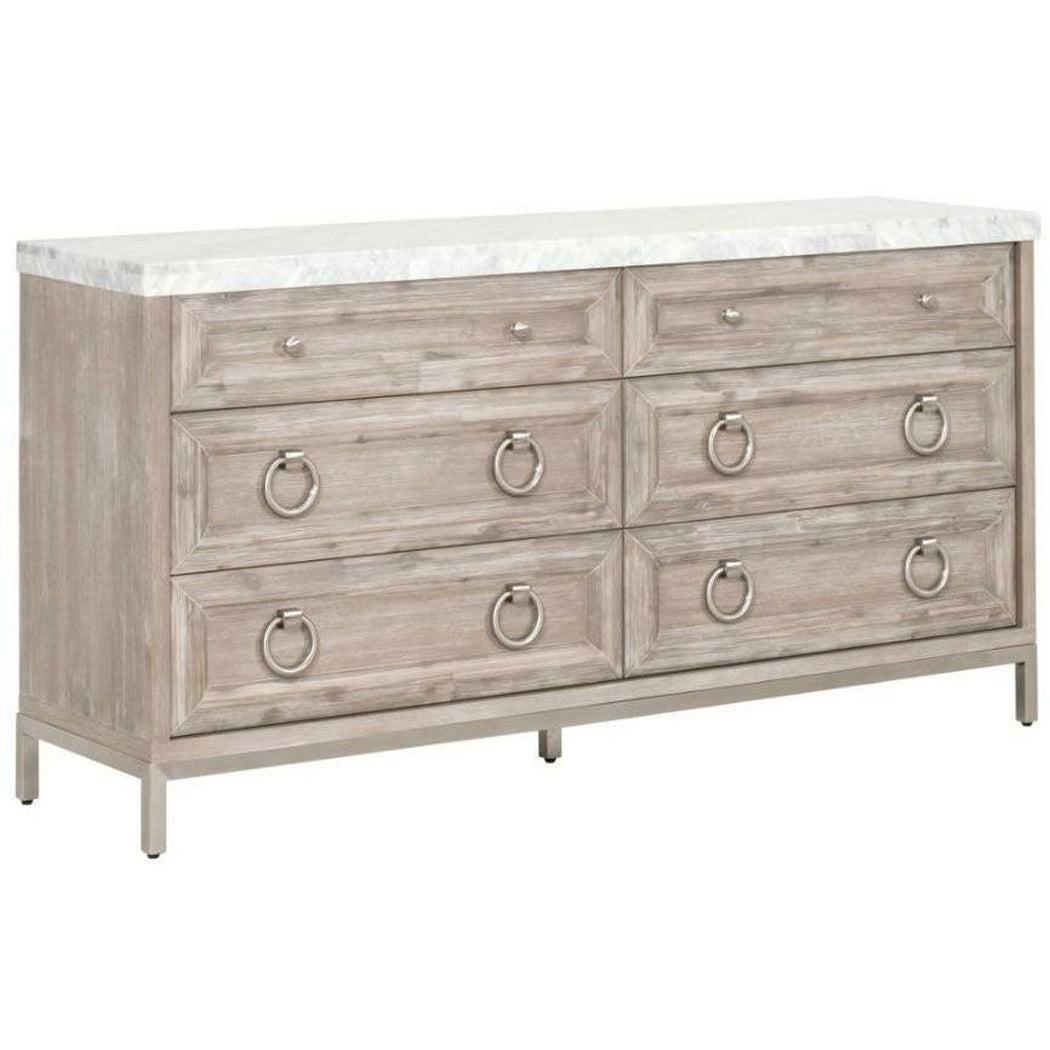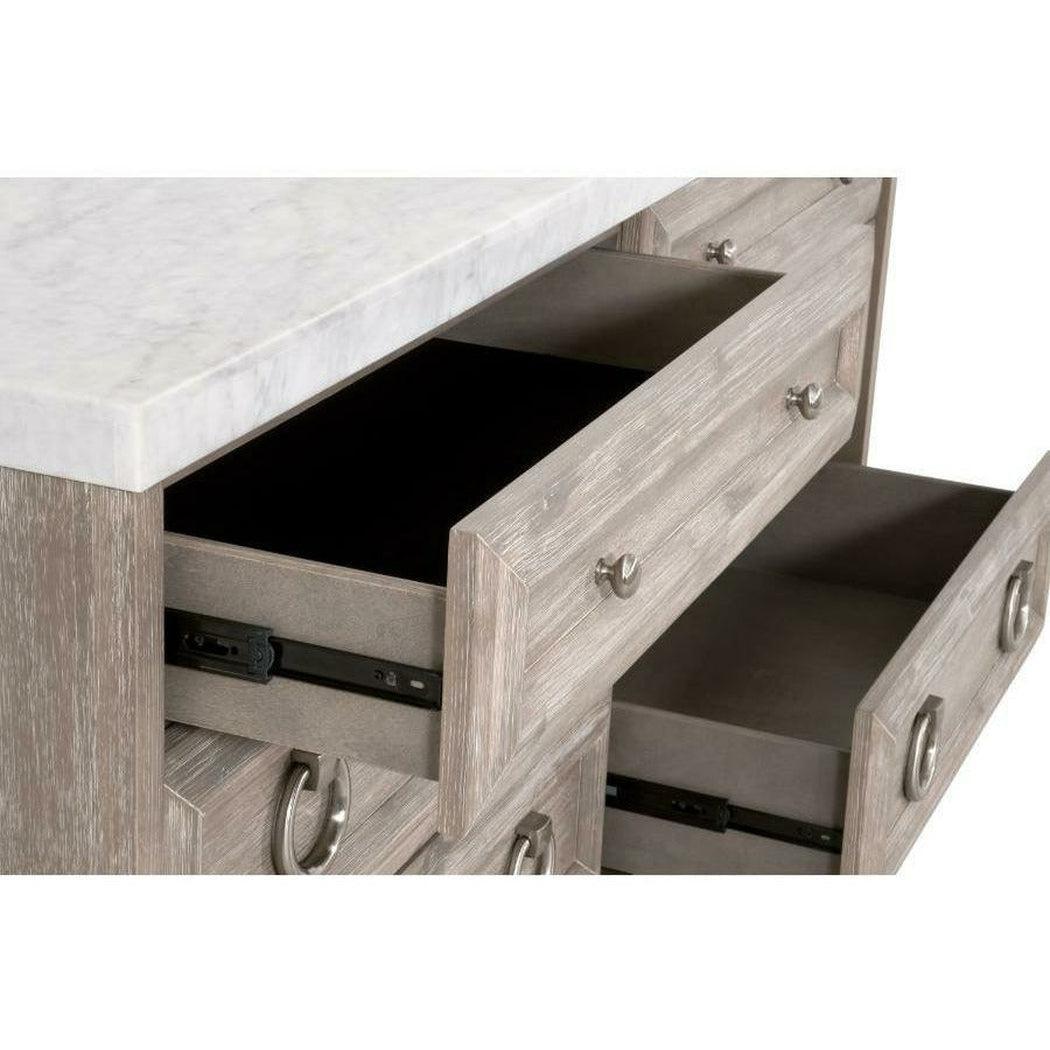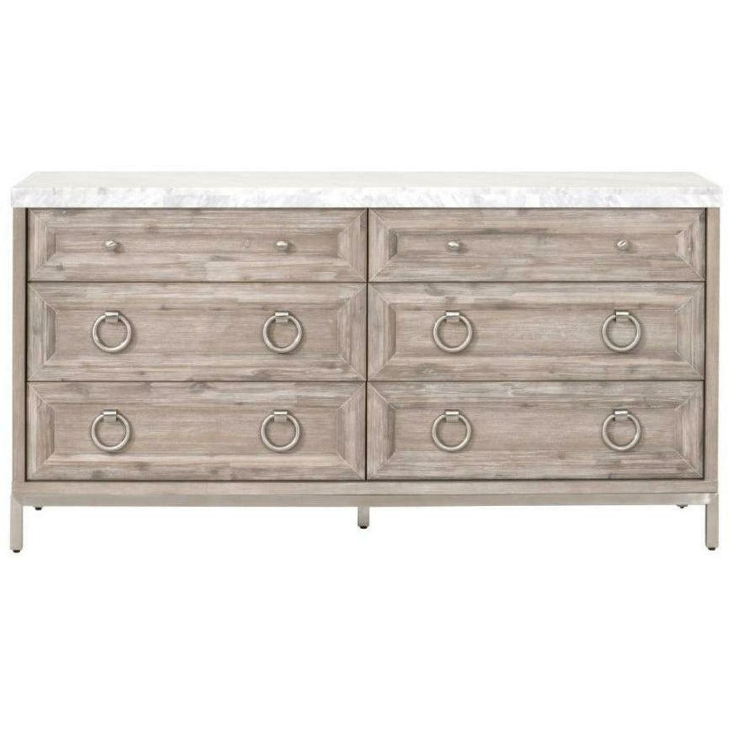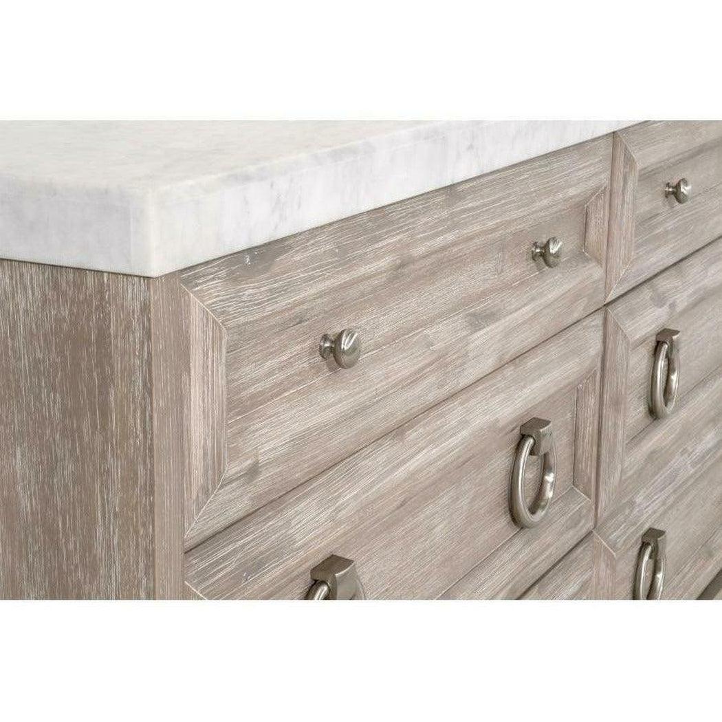 Enhance the sophistication and functionality of your bedroom with the exquisitely crafted Azure Carrera 6-Drawer Double Dresser White Marble Steel. Made from premium Italian marble and natural gray acacia wood, this dresser radiates elegance and luxury. The six storage drawers, equipped with full extension metal glides and lined with luxurious felt, provide effortless accessibility and a plush storage space for your belongings. The sandblasted finish on the Acacia Veneer adds a rustic touch, amplifying the natural grain and creating a stunning variation in color and texture. Embrace the individuality of each piece, appreciating the presence of natural knots, cracks, scratches, and marks as they enhance the charm and character of the product.