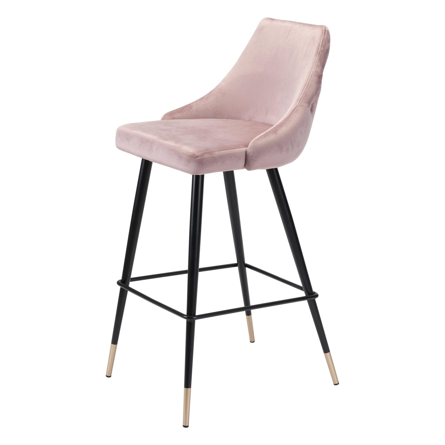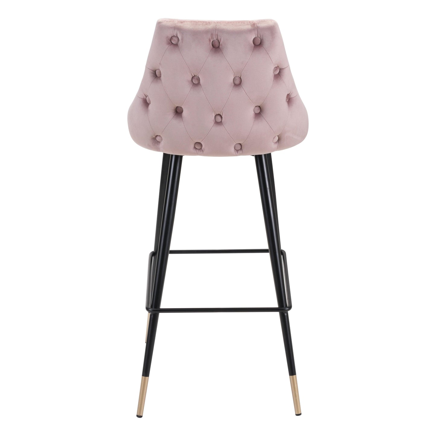 Make a fearless style statement with the Piccolo Bar Chair in Pink. This striking bar chair features a tapered back with elegant button tufting and slim brushed brass pencil legs that elevate any kitchen or bar space. Designed for both fashion and function, it includes supportive slats for a comfortable footrest and a sturdy powder-coated steel frame that holds up to 280 lbs. With bold design and durable materials, this chair is a daring addition to modern interiors.