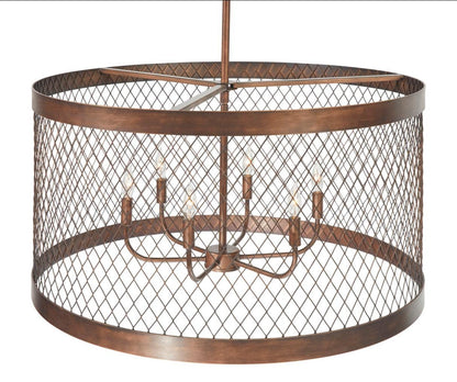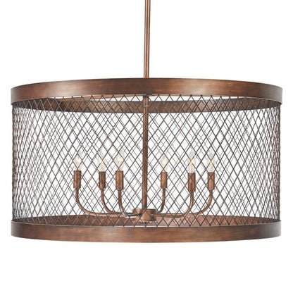 A bold choice for any room in need of eye-catching design. Elevate your room's style with this impressive six-arm chandelier. Its warm rusted tones and diagonal lattice pattern will motivate and inspire any bold adventurer. Light up your space and take risks with your decor - this chandelier has got you covered!