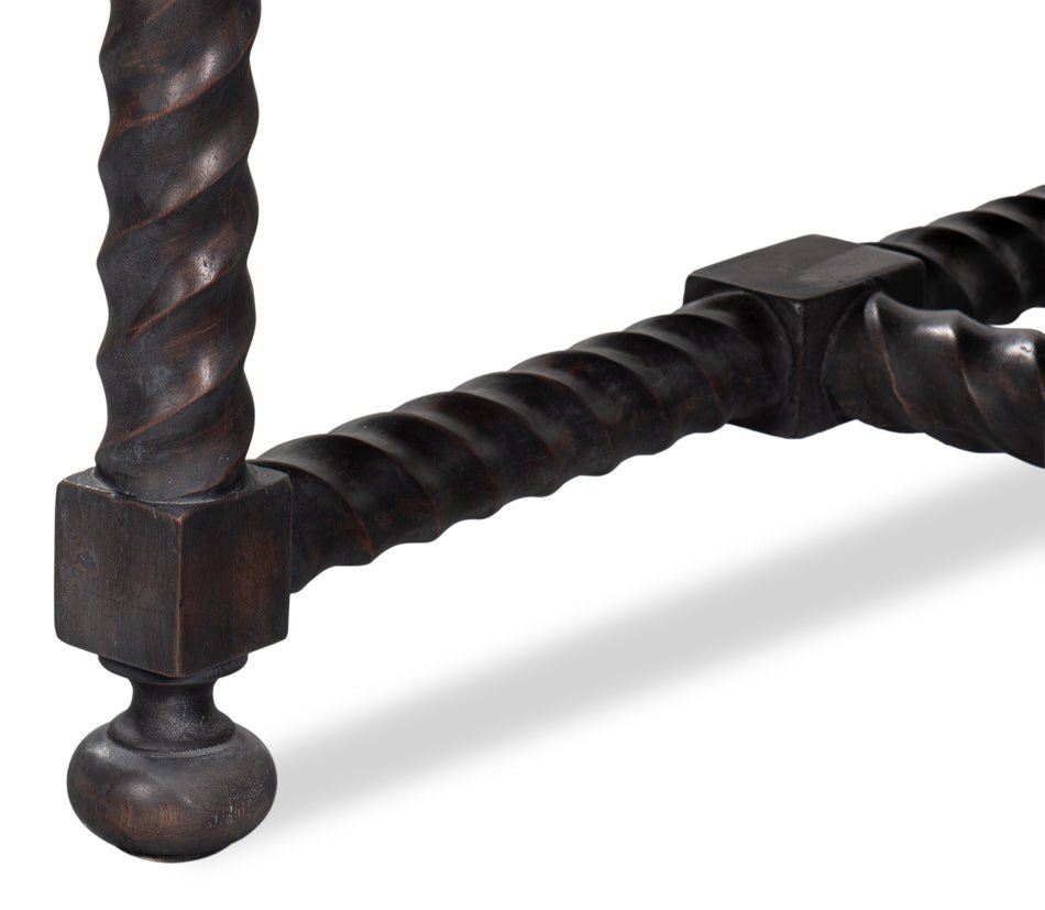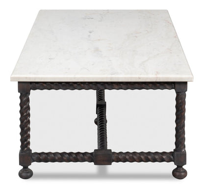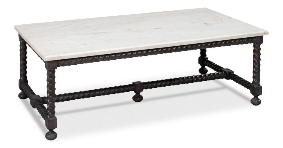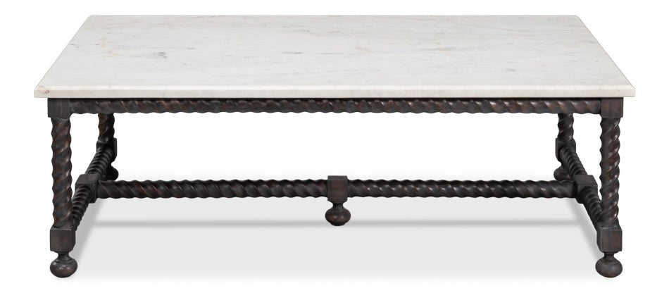 Crafted from high-quality materials, this table offers both durability and beauty. The dark twisted wood legs and stretcher, complemented by ball feet, create a sturdy base that supports the elegant marble top. Its rectangular shape provides ample surface area, making it ideal for displaying decorative items or serving drinks and snacks. The traditional style of the Barley Cocktail Table ensures it fits seamlessly into a variety of settings, from cozy living rooms to more formal sitting areas. Its grand scale and sophisticated design invite you to imagine endless decorating possibilities.