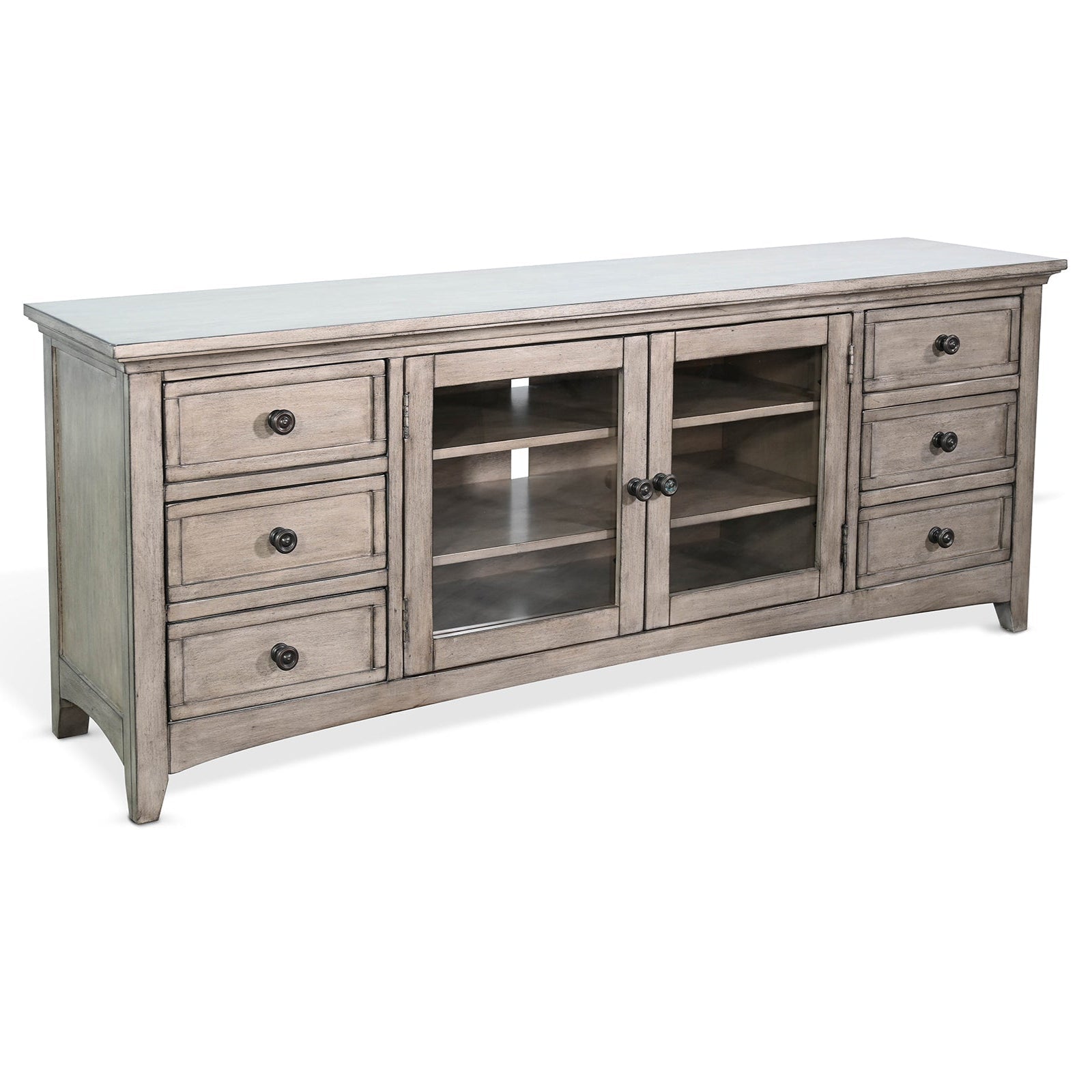 Elevate your living space with this elegant media console, combining style and function. Crafted from high-quality mahogany, it boasts a timeless design that suits any decor. Its grey color and distressed finish add warmth and character to your room. The console features six spacious drawers, perfect for organizing media essentials and keeping your space tidy. Sturdy construction ensures long-lasting durability. Glass doors add a touch of sophistication while allowing easy access to media devices. This piece requires no assembly, making it a hassle-free addition to your home.