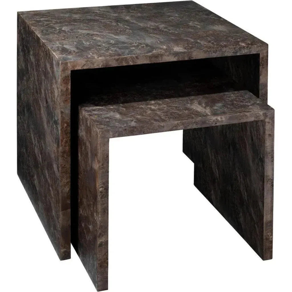 Enhance your home with the Bedford Burl Wood Nesting Tables, a sophisticated set of two that merges organic burl wood veneer with refined Parsons silhouettes. Each table showcases the natural, organic pattern of burl wood finished in either a soft natural brown stain or a delicate charcoal grey stain, bringing understated elegance and timeless charm to any room.
