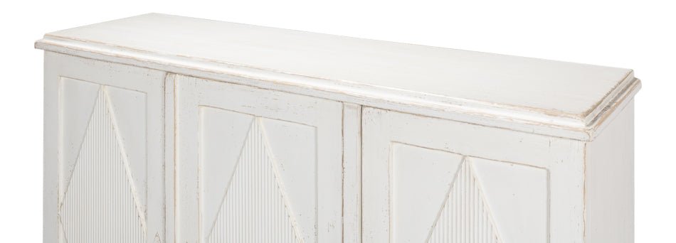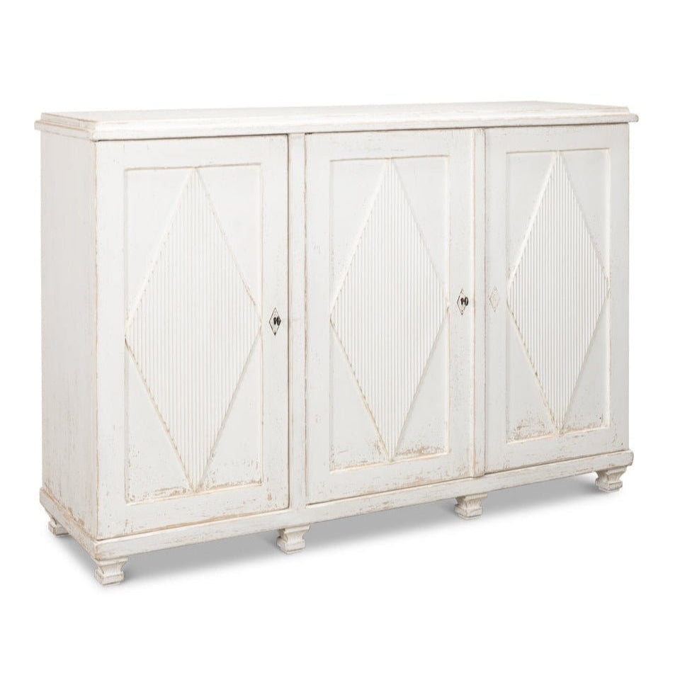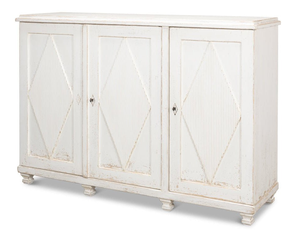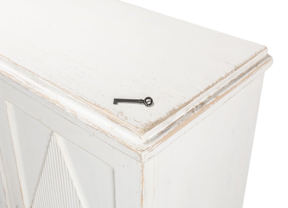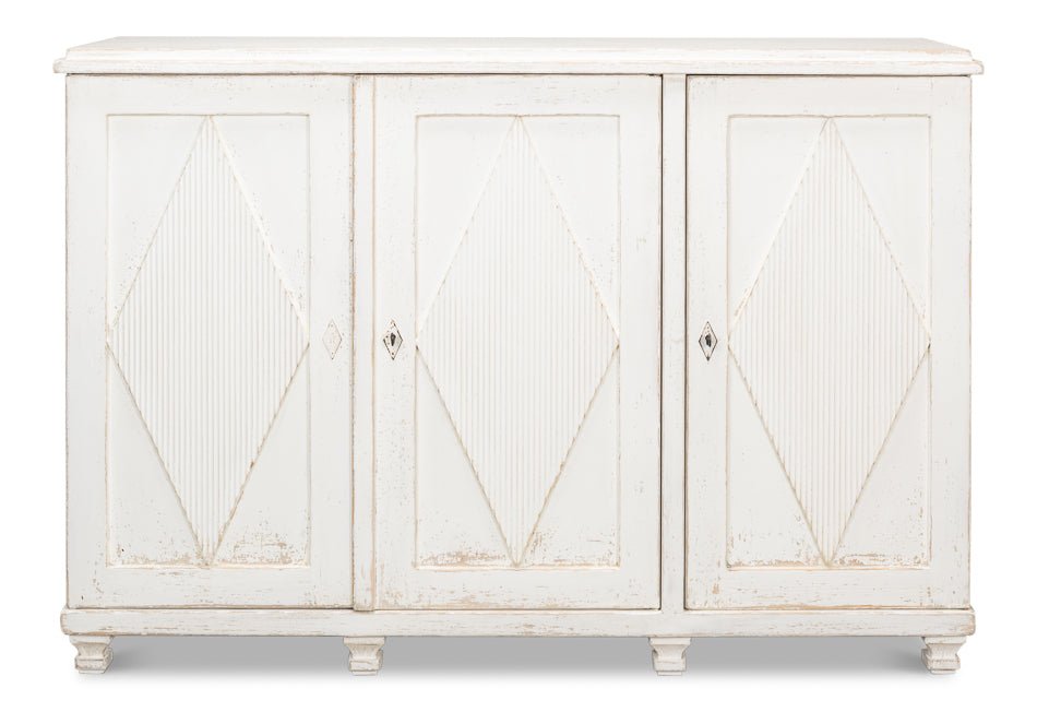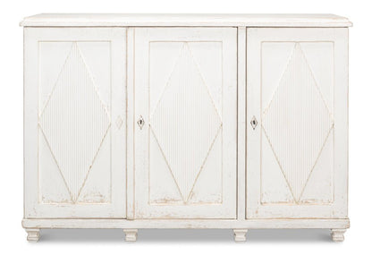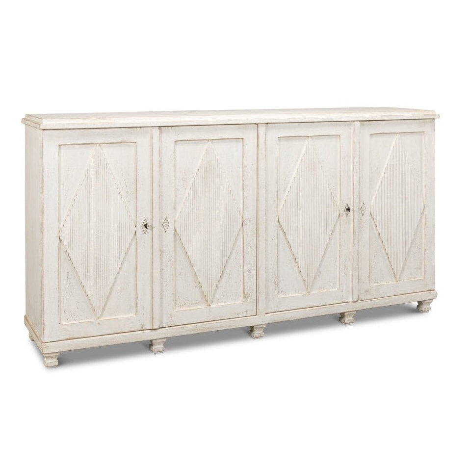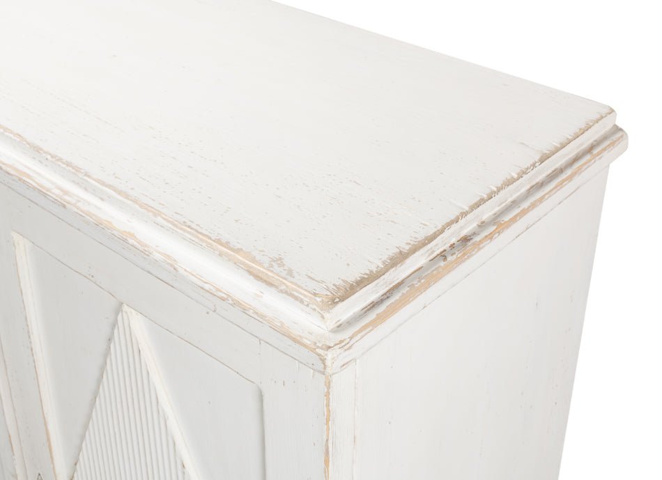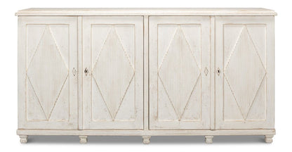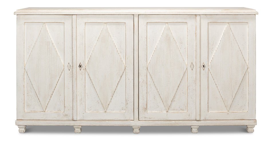Elevate your home with the Beecher Whitewash Wooden Sideboard, a perfect fusion of rustic charm and functional design. Made from reclaimed pine, this durable piece features a distressed white finish that evokes a vintage coastal vibe. Its distinctive diamond pattern on four doors, complemented by ribbed textures and metallic keyhole details, adds refined artistry. Inside, four fixed shelves provide generous storage for dinnerware, linens, or essentials. With a stable rectangular form and short legs, this sideboard offers both classic style and practicality, making it an elegant and versatile addition to any room.