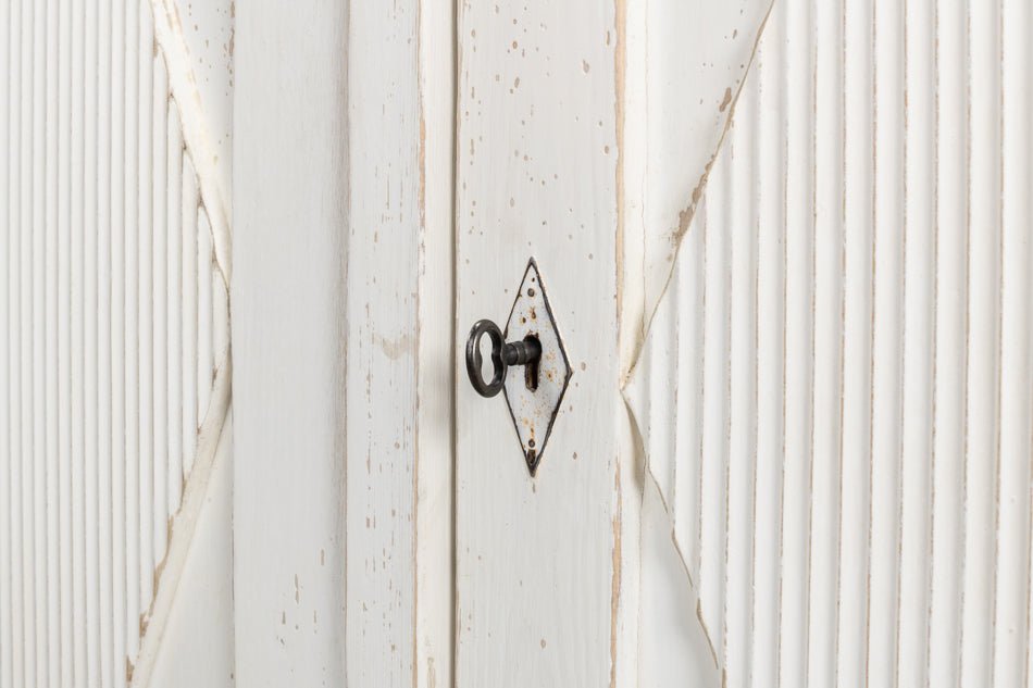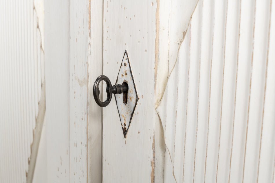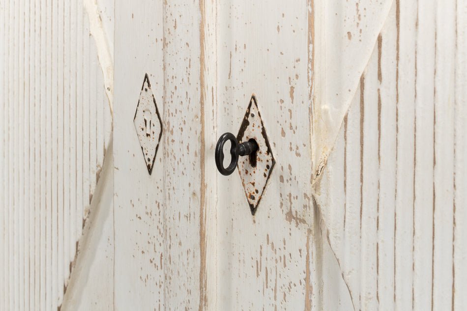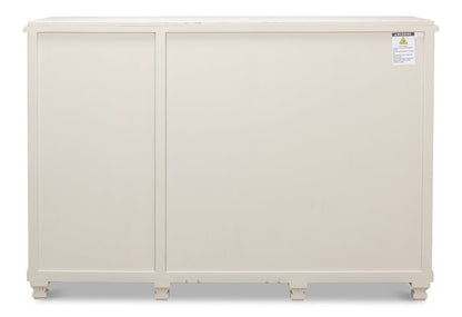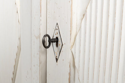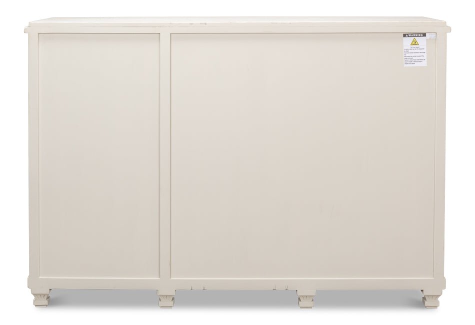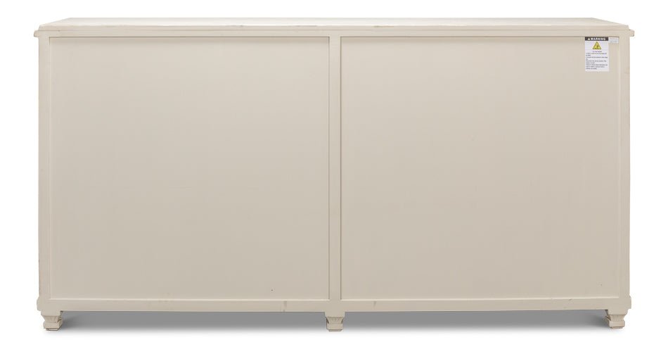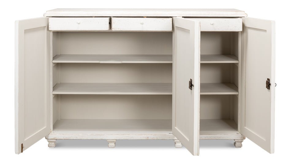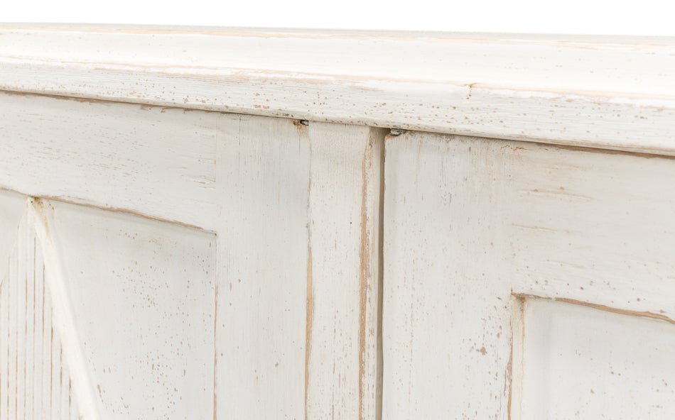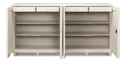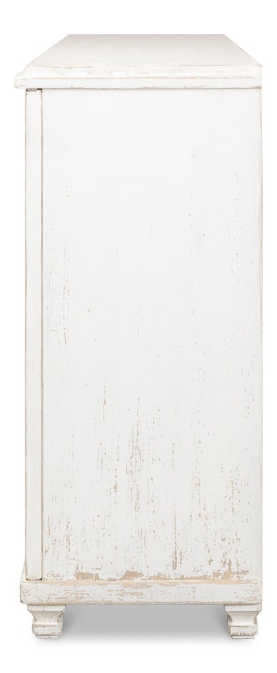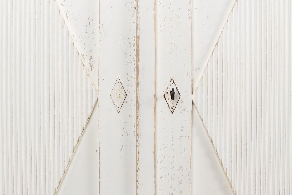 Elevate your home with the Beecher Whitewash Wooden Sideboard, a perfect fusion of rustic charm and functional design. Made from reclaimed pine, this durable piece features a distressed white finish that evokes a vintage coastal vibe. Its distinctive diamond pattern on four doors, complemented by ribbed textures and metallic keyhole details, adds refined artistry. Inside, four fixed shelves provide generous storage for dinnerware, linens, or essentials. With a stable rectangular form and short legs, this sideboard offers both classic style and practicality, making it an elegant and versatile addition to any room.