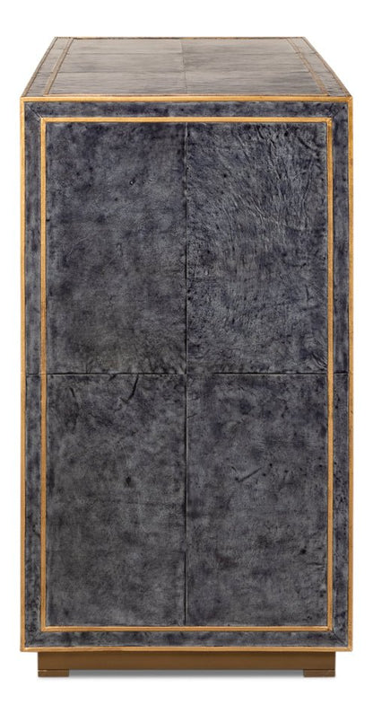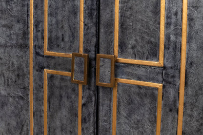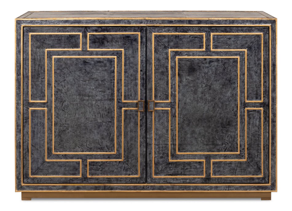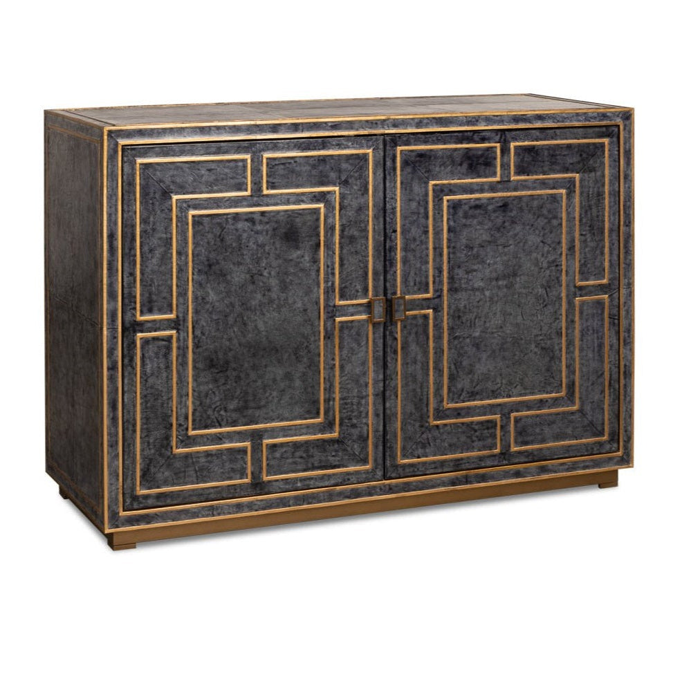 Embodying Hollywood elegance, the Bel Aire Cabinet adds a touch of glamour to any room. This two-door cabinet features a luxurious blue leather exterior with hand-painted gold details, blending timeless style with modern aesthetics. Its minimalist design is accentuated by a dark gray finish and gold geometric trim, creating a striking focal point in any setting. The cabinet's transitional style makes it versatile, seamlessly fitting into both classic and contemporary interiors. With its sophisticated look, it’s perfect for those looking to elevate their home decor.