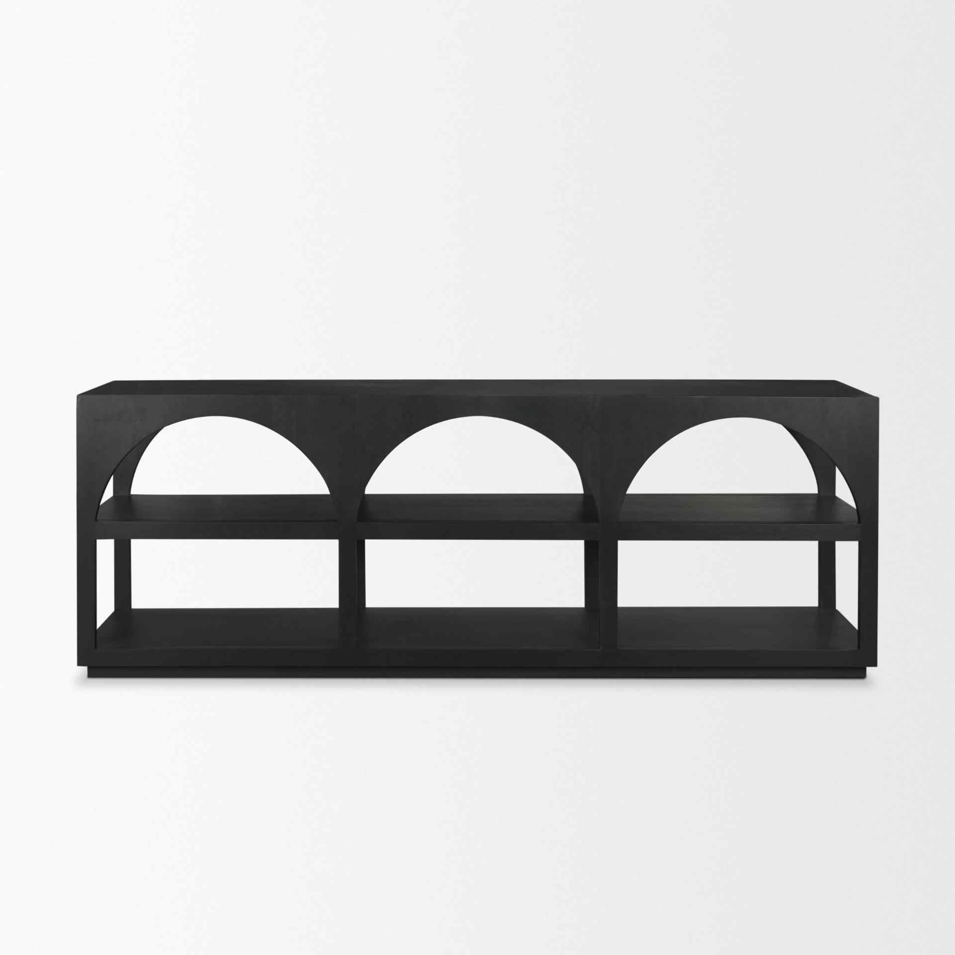 The Bela Large Arched Console Table is an elegant addition to any space. Crafted from solid mango wood, its robust structure and striking black-brown finish make it versatile and timeless. The design features three graceful arches and two open shelves, giving it an airy feel that enhances any room's decor. This console table is perfect for showcasing decorative items or keeping essentials within easy reach. It can blend seamlessly with various interior styles, thanks to its classic finish and minimalist design. Whether in a hallway, living room, or office, it offers both function and style, elevating your home's aesthetic.