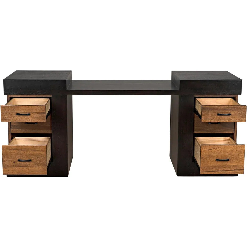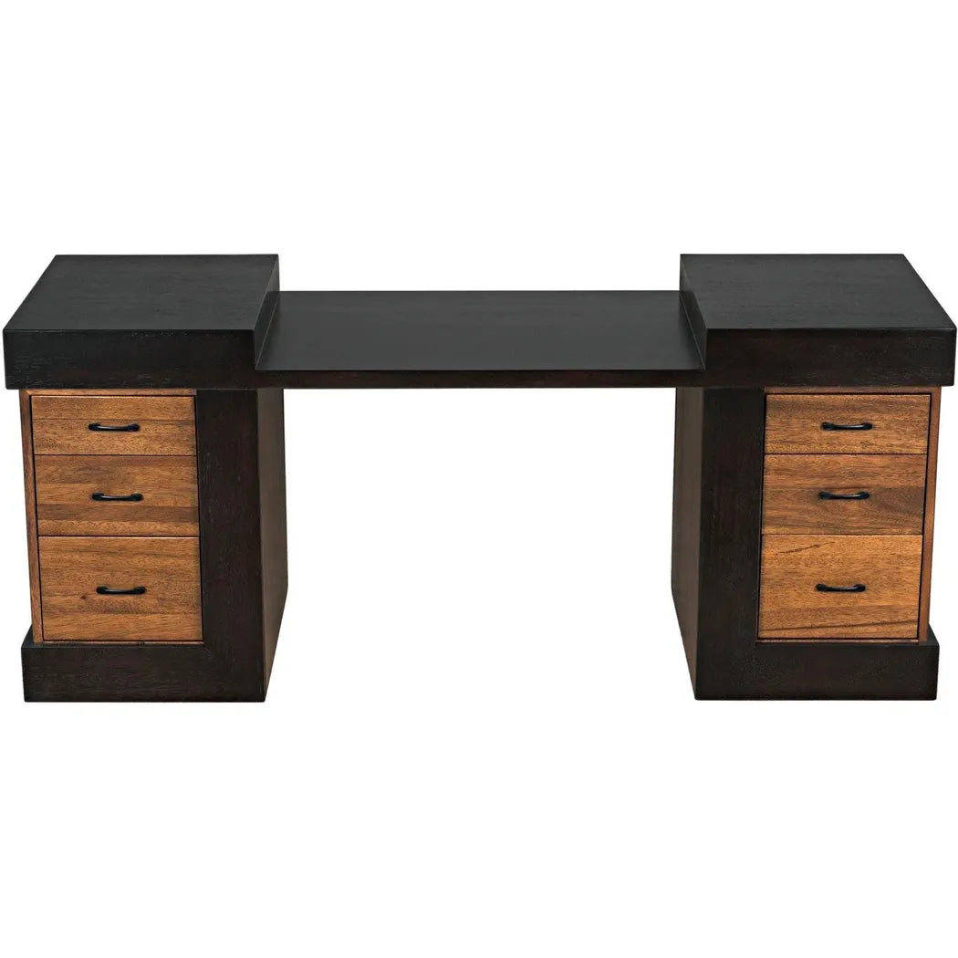 The Bentley Desk offers a sophisticated and unique design with its dark ebony walnut finish and wide trim. This expertly crafted desk features three drawers on each side and a centered plank work surface, perfect for storing and organizing your work essentials. With its blackened drawer pulls, it exudes a modern and professional look. Our Bentley desk contrasts a dark walnut base with wide trim on all four sides in our ebony walnut finish. Three drawers on each side are joined by a centered plank work surface. Blackened drawer pulls.