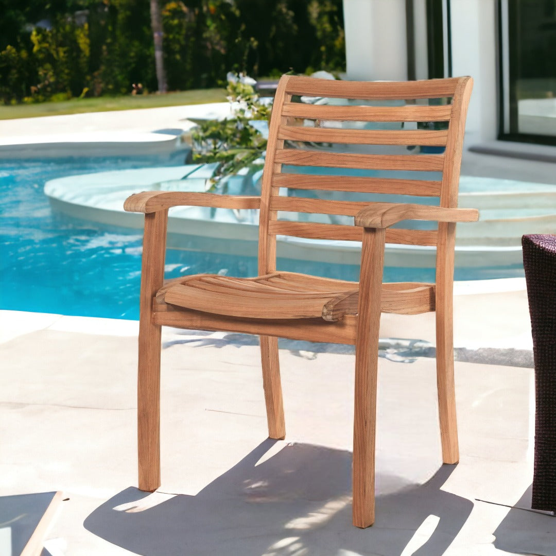 The Birmingham Armchair dares to be different - with a sturdy and spacious design that sets it apart from other teak chairs! The gracefully curved slats provide unparalleled comfort, making it perfect even for the largest dinner gatherings. No cushions are needed here! Paired with the Birmingham Square Table, ideal for 4, this set includes one Square Birmingham Dining Table and four Birmingham Dining armchairs. Birmingham Square Dining Table dimensions: Width 39.5" Length 39.5" Height 29.5", while Birmingham Dining Arm Chairs boast the following dimensions: Seat Width 16.85", Seat Depth 20.5", Seat Height 18", Arm Height 25.5".