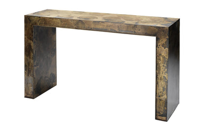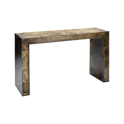 Transform your space with the luxurious elegance of the Black Iron Sheet Charlemagne Console Table. Crafted from lightweight iron, this console boasts a mesmerizing swirling mineral patina that enhances its earthy alloy tones. Its sleek surfaces showcase a subtle iridescence, adding a touch of glamour to any room. Bring sophistication and artistry to your home with this exquisitely designed table. Its linear, minimalist design in rich metallic tones exudes subtle glamour, making it the perfect addition to any space. Delicately crafted from lightweight iron and adorned with a swirling mineral patina, this stylish console table adds a touch of opulence to any room, reflecting an elegant iridescence that elevates its surroundings.