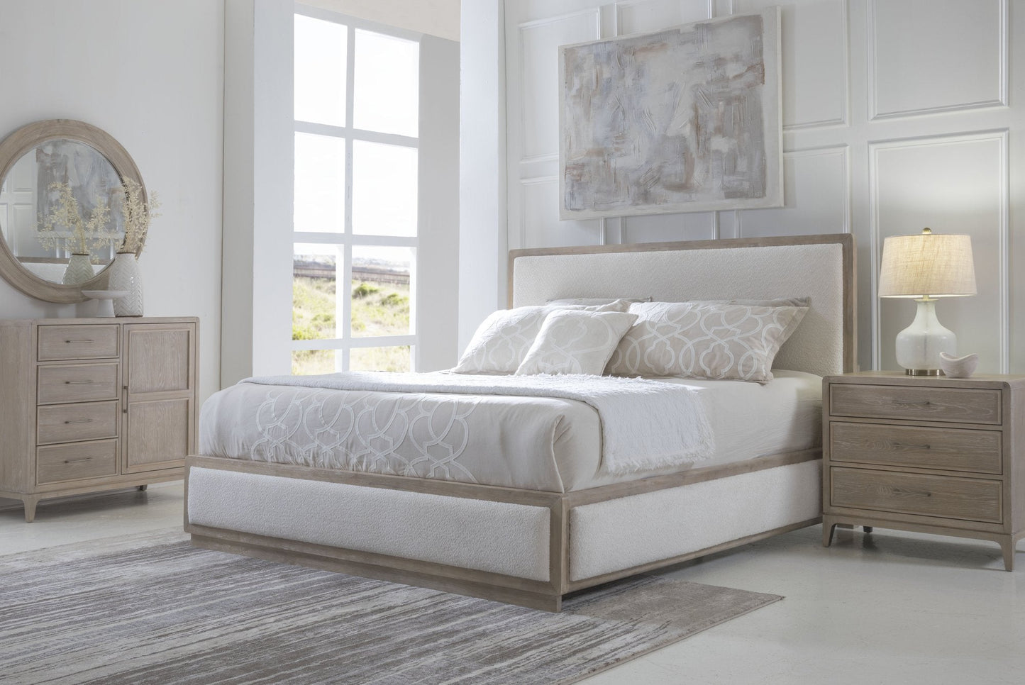 The Bodhi King and Queen Bed offers a blend of modern style and elegant comfort, perfect for any contemporary bedroom. The luxurious ivory boucle performance fabric graces the headboard, footboard, and side rails, creating a sophisticated look. The bed's frame showcases a natural light tone with wire brushing, enhancing the oak veneer’s woodgrain for a refined finish. This combination of materials ensures durability and a timeless aesthetic that fits seamlessly into various decor styles. Its low profile, featuring a low footboard and wide side rails, adds a touch of casual elegance, making it an excellent choice for those seeking both style and simplicity.