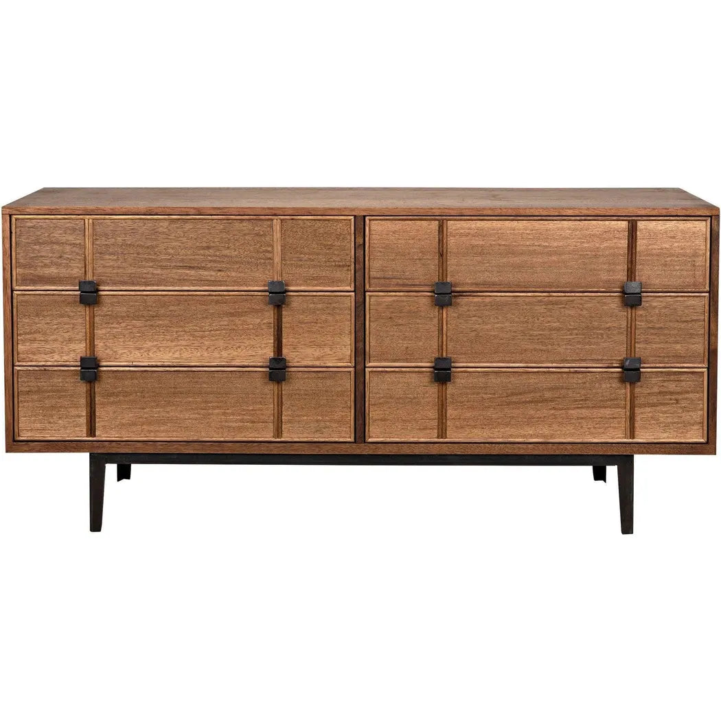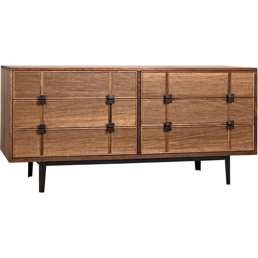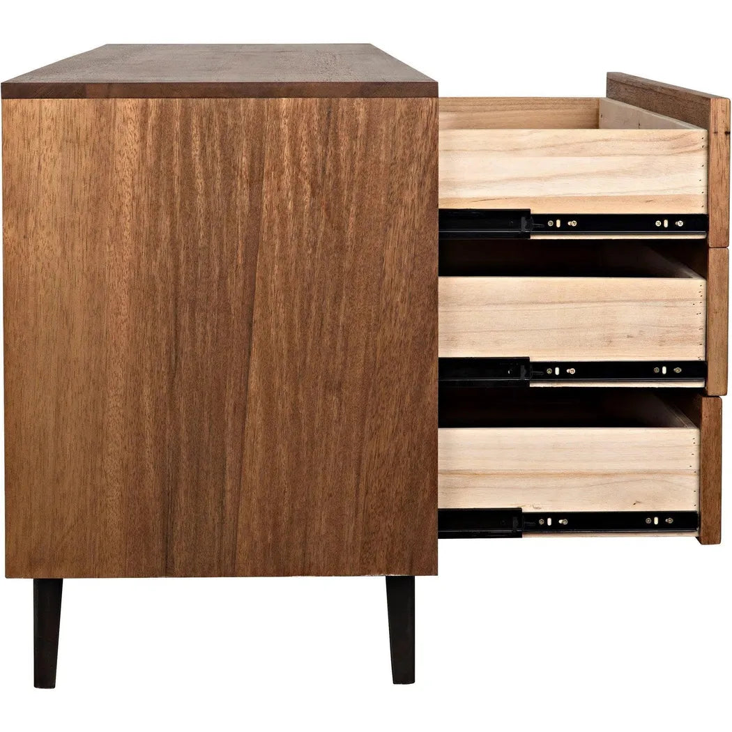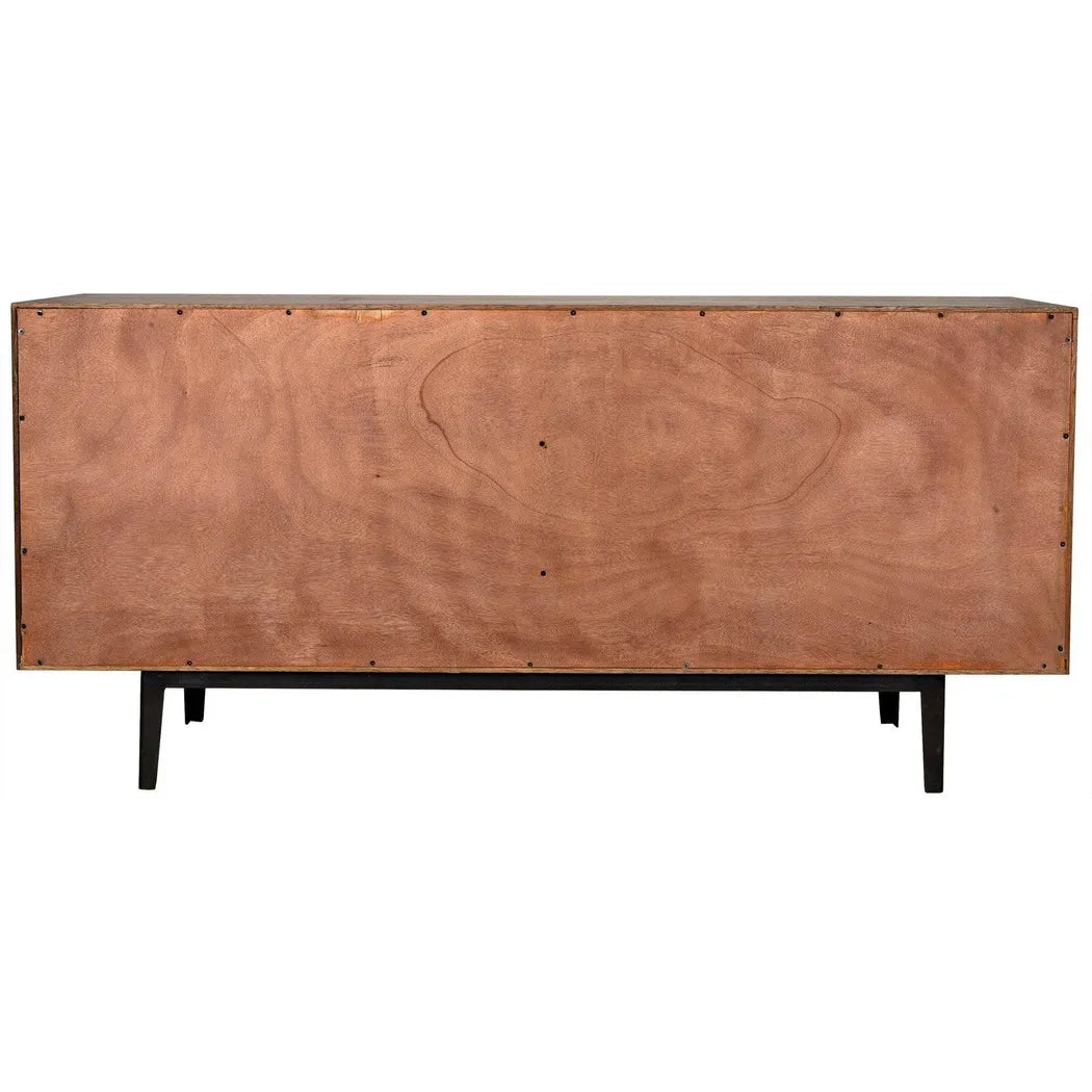Effortlessly blend tradition with modern edge with our Bourgeois Wood and Steel Sideboard. Made with carved walnut and a hand-applied dark finish, its sleek metal base adds a touch of edge to the otherwise traditional design. Bring contemporary elegance to your space with this transitional piece. Simple linear carvings are all the embellishment this transitional sideboard requires. Carved of walnut with a hand-applied dark finish, its minimally finished metal base adds a touch of edge to an otherwise traditional design. The carved walnut with its hand-applied dark finish highlights the intricate yet simple carvings, creating a transitional sideboard that blends traditional design with a modern edge.