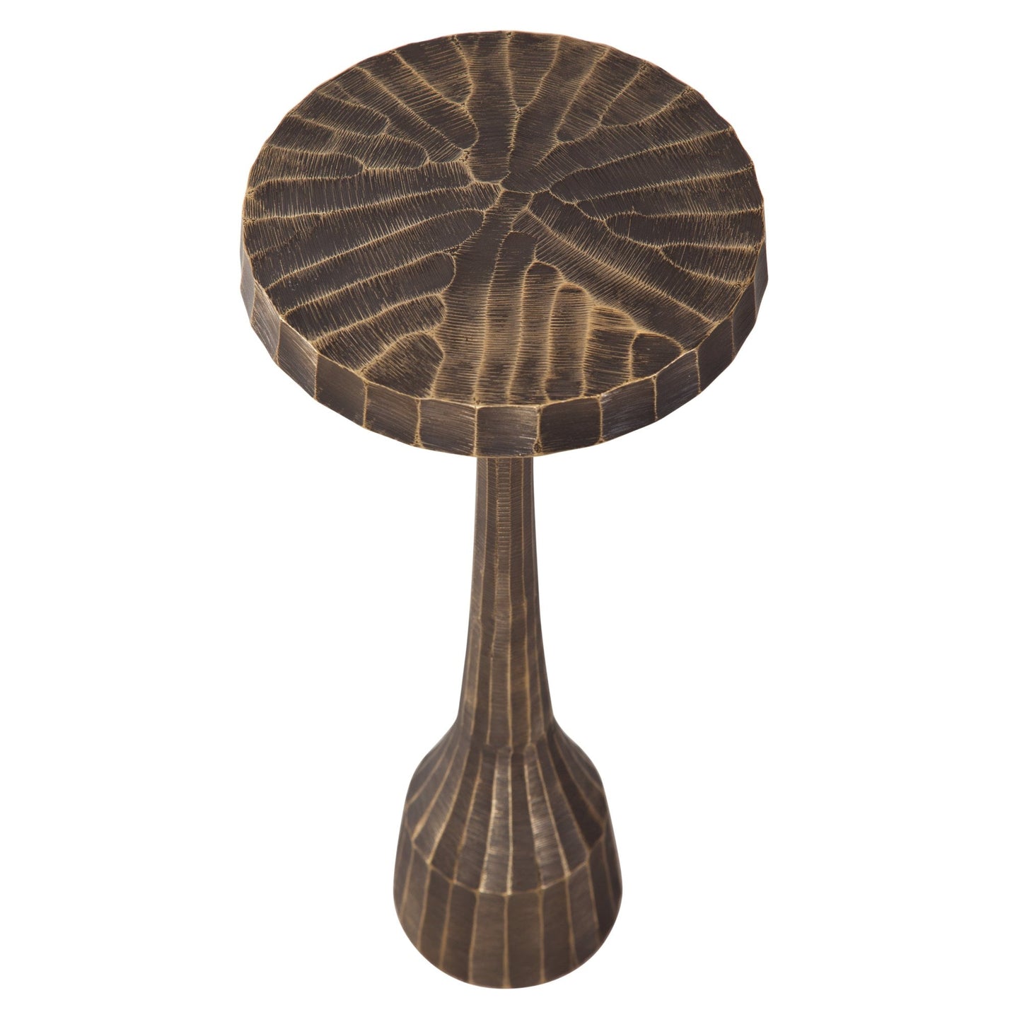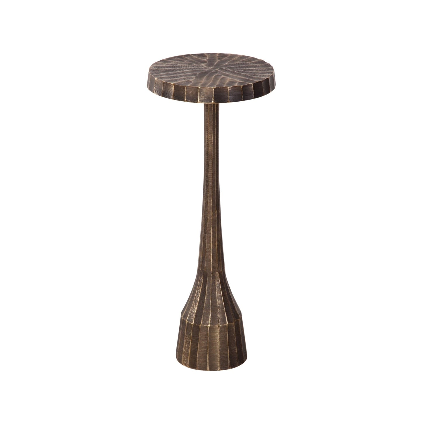 Meticulously crafted from cast aluminum in a stunning brass tone, its antique brass finish radiates charm. The strikingly textured finish flows from the circular top to the tapered base, creating a stylish and captivating focal point. And with minimal assembly required, it's a effortless yet chic addition to elevate any space. Avoid the wait and bring bold sophistication to your space with this remarkable accent table! Embrace the magnificent brass tone and antique finish, and prepare to impress visitors with this contemporary, dynamically textured table!