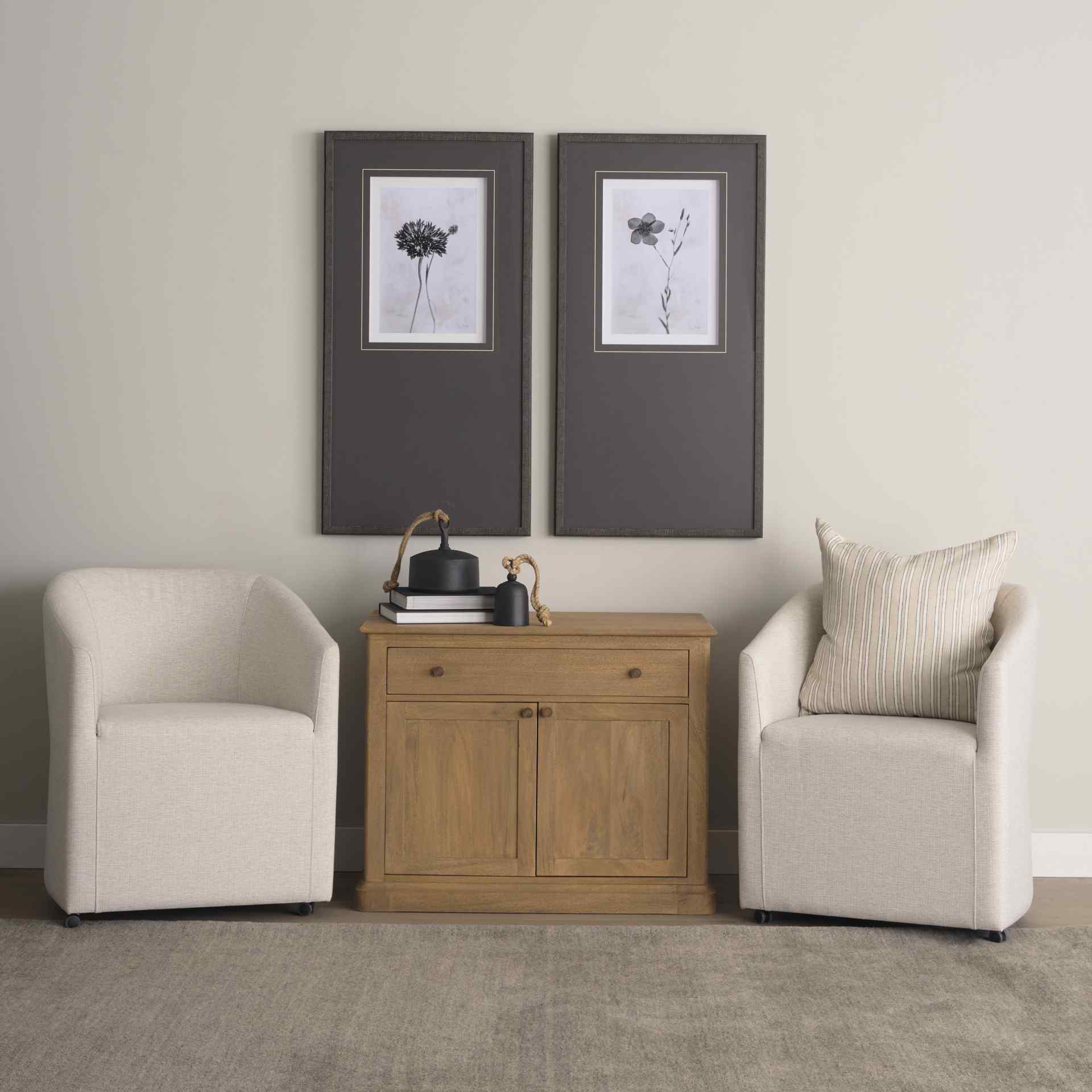 The Braxton Accent Cabinet is a versatile addition that enhances any room with both character and functionality. Made from smooth dark-light brown mango wood, it offers a warm, rich tone that complements its sophisticated design. Featuring a single drawer and two Shaker-style doors, this cabinet showcases unique rounded iron hardware in an antiqued brass finish. Its timeless elegance is perfect for those seeking understated yet stylish charm in their living spaces.