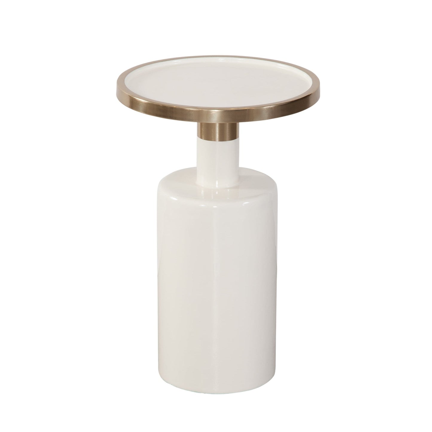 Meet the Brice Accent Table, a contemporary statement piece in elegant white. Crafted from iron with a sleek painted white finish and chrome accents, this table boasts a clean, glossy look. Its circular shape and the unique chrome finish at the table's edge, extending to the base, offer a touch of modern sophistication. With no assembly required, it's a seamless addition to elevate your space.
