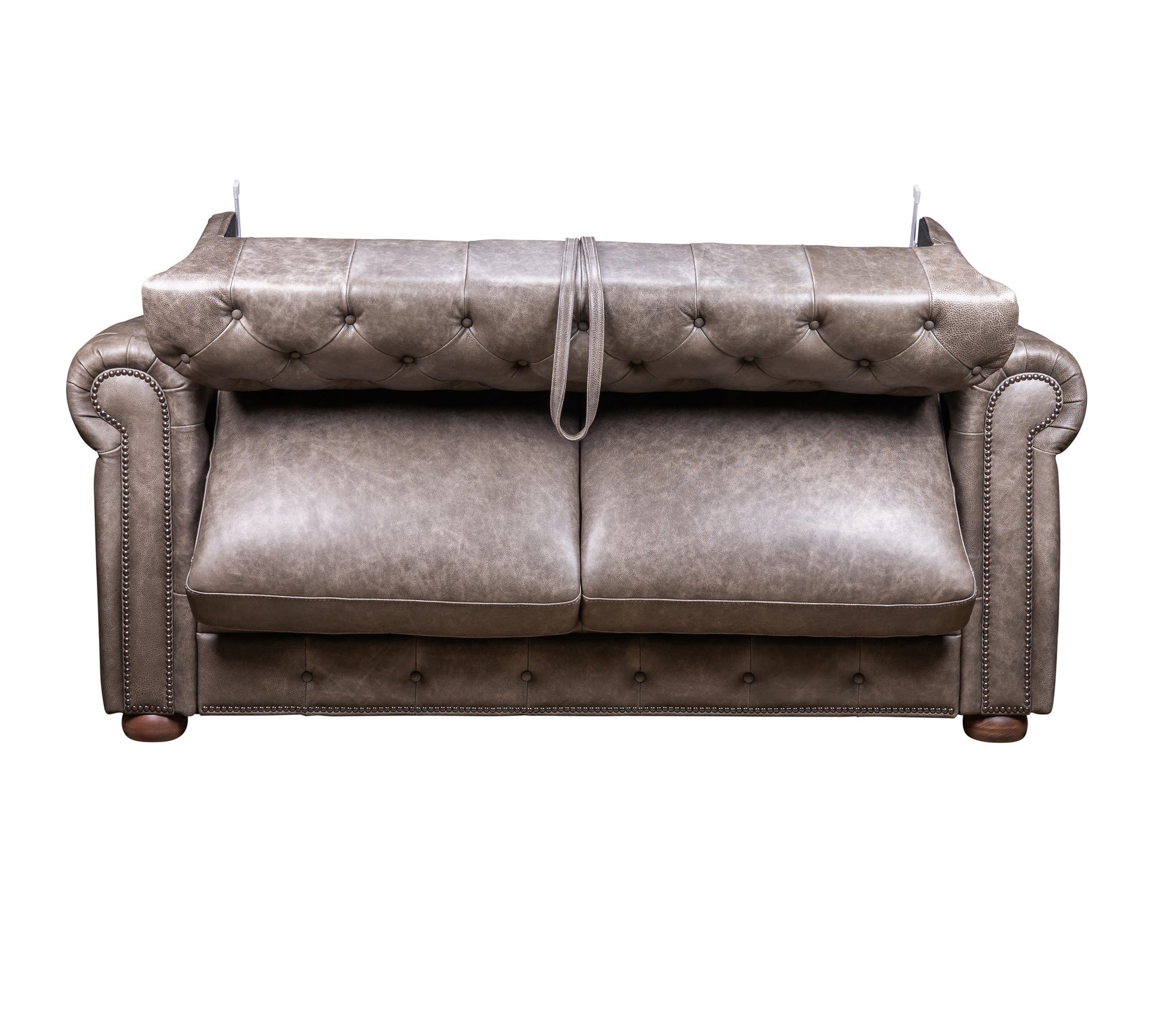 Crafted with high-quality leather, foam, and wood, this piece promises durability and comfort. The Jersey Slate finish and dark walnut wooden legs enhance its refined look, while the nailhead trim adds a touch of elegance. The plush cushions ensure a comfortable seating experience, making it a versatile addition to your home. The queen memory foam mattress provides a restful night's sleep, offering both support and comfort.