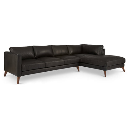 The Burbank Large Leather Right Facing Sectional Sofa embodies the iconic style of 1950s Los Angeles, evoking feelings of nostalgia and happiness. Featuring elegant lines and angled hardwood legs, it is the perfect choice for any modern home. The frame of this piece is crafted from durable kiln-dried hardwood, hardwood plywood, and exposed hardwood legs and bases, providing a sturdy foundation.