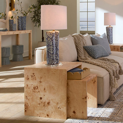 Enhance your home with the Bedford Burl Wood Nesting Tables, a sophisticated set of two that merges organic burl wood veneer with refined Parsons silhouettes. Each table showcases the natural, organic pattern of burl wood finished in either a soft natural brown stain or a delicate charcoal grey stain, bringing understated elegance and timeless charm to any room.