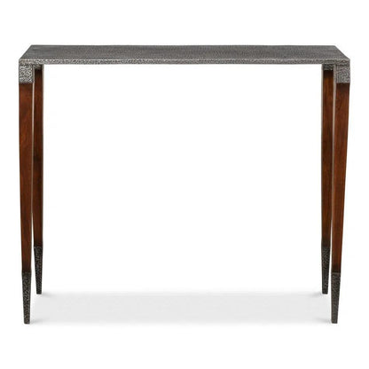Step into transitional design with our Burnford Console Table. Chic iron finish, crowned with solid French walnut legs, this table is a timeless gem for any home. Understated elegance and durability make it perfect for modern or classic spaces. Elevate your home's style with the Burnford Console Table Antiqued Finish.