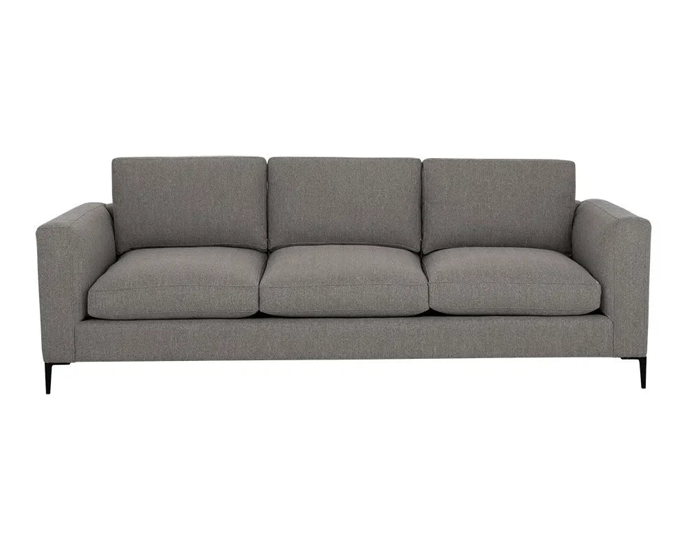 Make an earth-conscious decision while browsing the DOMESTIC by SUNPAN collection. Create an inviting space with this luxurious sofa from our DOMESTIC collection. Features a deep seat with generously curved armrests for added comfort. Reversible, feather-wrapped cushions will take relaxation to a new level. Black metal legs complete the look. Stocked in liv smoke and wicker performance fabric. Coordinating armchair also available. Liv performance fabric features 32% REPREVE polyester; it is moisture repellent, durable and easy to clean. REPREVE polyester is a high-quality yarn made from recycled post-consumer plastic bottles. As this piece features feather-filled cushions, occasional rotation and fluffing is required to maintain its lasting comfort and beauty. Visit our Product Care page for more information. Materials: Fabric, Iron Colors: Liv Smoke; Liv Wicker Dimensions (in): 98 W x 41 D x 34 H Weights (lb): 176 Country Of Origin: Canada Repreve Polyester is Made from Recycled Post-Consumer Plastic Bottles / Feather and Fiber Filled Back Pillows / Reversible Seat and Back Cushions 68% Polyester, 32% Repreve Polyester Due to various screen settings the color of the item may look slightly different in person from what you see on your screen. We try to make sure that the image you see is as accurate as possible.