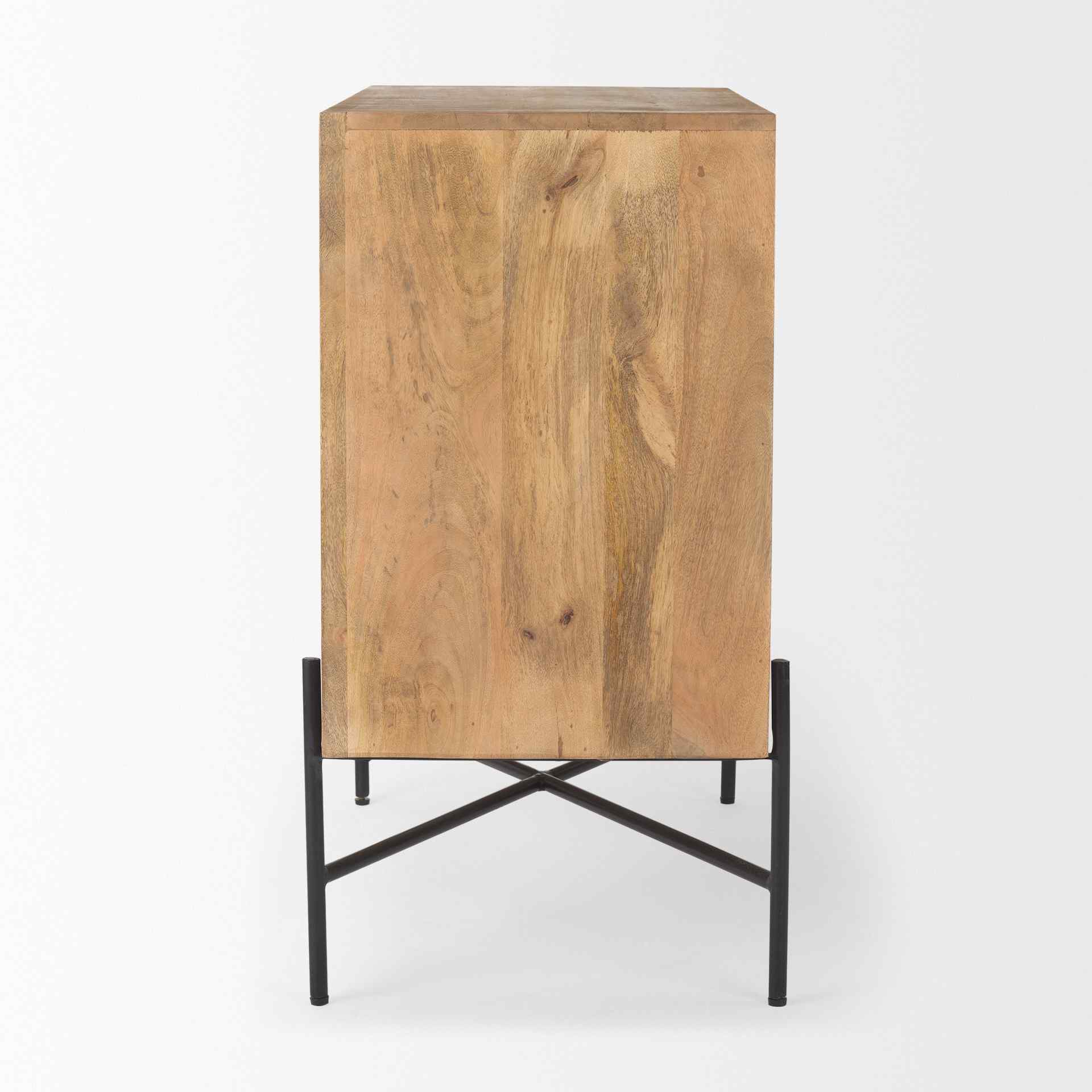 The Cairo Two Doors Wood Cabinet combines style and functionality, making it a perfect addition to any home. Crafted from quality mango wood, this cabinet features a light brown finish that adds warmth and charm to any space. Its solid wood façade is complemented by a sturdy, matte black iron frame, ensuring both durability and elegance. The cabinet's two doors showcase an eye-catching geometric pattern with vertical and triangle motifs, offering a unique touch that enhances its contemporary design.